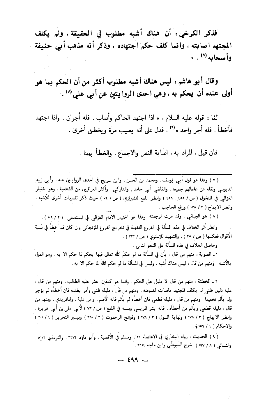 فَذكر الْكَرْخِي أَن هُنَاكَ أشبه مَطْلُوب فِي الْحَقِيقَة وَلم يُكَلف الْمُجْتَهد إِصَابَته وَإِنَّمَا كلف حكم اجْتِهَاده وَذكر أَنه مَذْهَب أبي حنيفَة وَأَصْحَابه