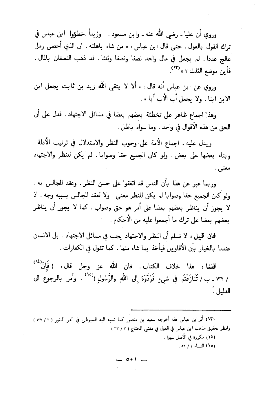 قُلْنَا هَذَا خلاف الْكتاب فَإِن الله عز وَجل قَالَ {فَإِن تنازعتم فِي شَيْء فَردُّوهُ إِلَى الله وَالرَّسُول} وَأمر بِالرُّجُوعِ إِلَى الدَّلِيل