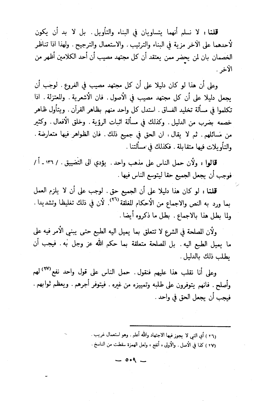 وعَلى أَنا نقلب هَذَا عَلَيْهِم فَنَقُول حمل النَّاس على قَول وَاحِد نفع لَهُم وَأصْلح فَإِنَّهُم يتوافرون على طلبه وتمييزه من غَيره فيتوفر أجرهم ويعظم ثوابهم فَيجب أَن يَجْعَل الْحق فِي وَاحِد