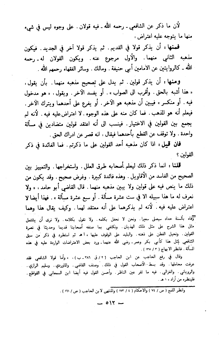 قُلْنَا إِنَّمَا ذكر ذَلِك ليعلم أَصْحَابه طرق الْعِلَل واستخراجها والتمييز بَين الصَّحِيح من الْفَاسِد من الْأَقَاوِيل وَهَذِه فَائِدَة كَبِيرَة وغرض صَحِيح وَقد يكون من ذَلِك مَا ينص فِيهِ على قَوْلَيْنِ وَلَا يبين مذْهبه مِنْهُمَا قَالَ القَاضِي أَبُو حَامِد وَلَا نَعْرِف لَهُ مَا هَذَا سَبيله إِلَّا فِي سِتّ عشرَة مَسْأَلَة أَو سبع عشرَة مَسْأَلَة فَهَذَا أَيْضا لَا اعْتِرَاض عَلَيْهِ فِيهِ لِأَنَّهُ لم يذكرهما على أَنه مُعْتَقد لَهما وَكَيف يُقَال هَذَا وهما