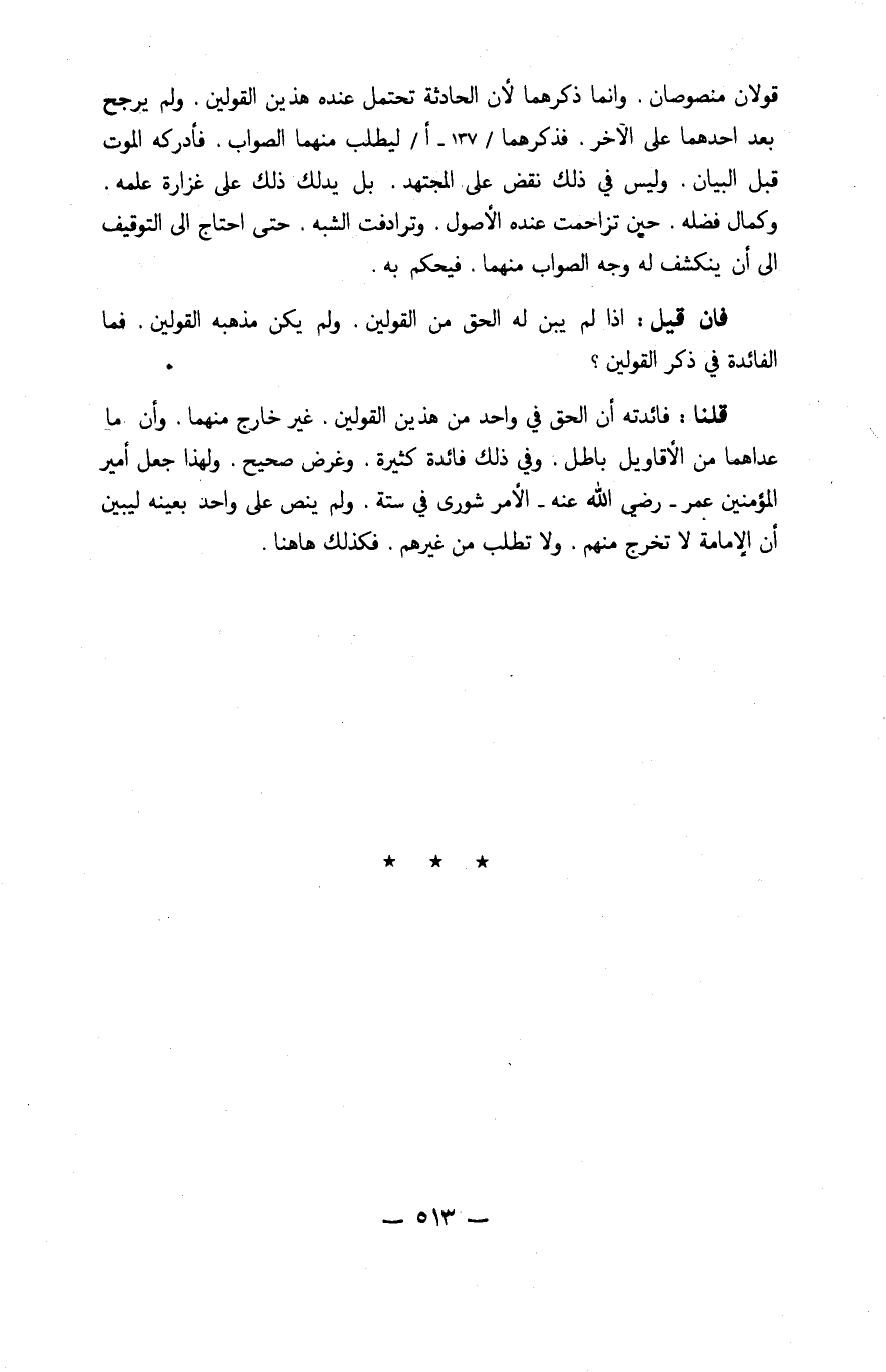 قُلْنَا فَائِدَته أَن الْحق فِي وَاحِد من هذَيْن الْقَوْلَيْنِ غير خَارج مِنْهُمَا وَأَن مَا عداهما من الْأَقَاوِيل بَاطِل وَفِي ذَلِك فَائِدَة كَثِيرَة وغرض صَحِيح وَلِهَذَا جعل أَمِير الْمُؤمنِينَ عمر رَضِي الله عَنهُ الْأَمر شُورَى فِي سِتَّة وَلم ينص على وَاحِد بِعَيْنِه ليبين أَن الْإِمَامَة لَا تخرج مِنْهُم وَلَا تطلب من غَيرهم فَكَذَلِك هَاهُنَا