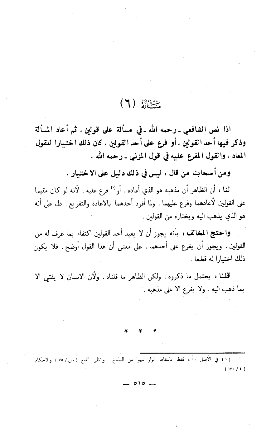إِذا نَص الشَّافِعِي رَحمَه الله فِي مَسْأَلَة على قَوْلَيْنِ ثمَّ أعَاد الْمَسْأَلَة وَذكر فِيهَا أحد الْقَوْلَيْنِ أَو فرع على أحد الْقَوْلَيْنِ كَانَ ذَلِك اخْتِيَارا لِلْقَوْلِ الْمعَاد وَالْقَوْل المفرع عَلَيْهِ فِي قَول الْمُزنِيّ رَحمَه الله