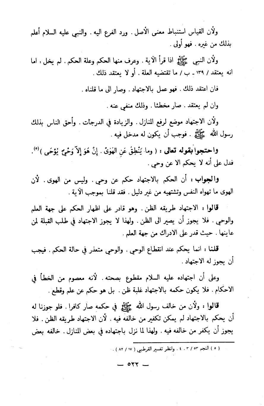 وَلِأَن النَّبِي صلى الله عَلَيْهِ وَسلم إِذا قَرَأَ الْآيَة وَعرف مِنْهَا الحكم وَعلة الحكم لم يخل أما إِنَّه يعْتَقد مَا تَقْتَضِيه الْعلَّة أَو لَا يعْتَقد ذَلِك