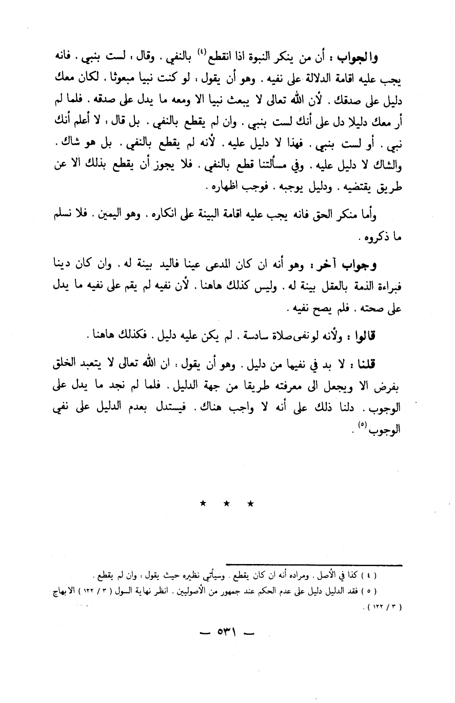 وَالْجَوَاب أَن من يُنكر النُّبُوَّة إِذا انْقَطع بِالنَّفْيِ وَقَالَ لست بِنَبِي فَإِنَّهُ يجب عَلَيْهِ إِقَامَة الدّلَالَة على نَفْيه وَهُوَ أَن يَقُول لَو كنت نَبيا مَبْعُوثًا لَكَانَ مَعَك دَلِيل على صدقك لِأَن الله تَعَالَى لَا يبْعَث نَبيا إِلَّا وَمَعَهُ مَا يدل على صدقه فَلَمَّا لم أر مَعَك دَلِيلا دلّ على أَنَّك لست بِنَبِي وَإِن لم يقطع بِالنَّفْيِ بل قَالَ لَا أعلم أَنَّك نَبِي أَو لست بِنَبِي فَهَذَا لَا دَلِيل عَلَيْهِ لِأَنَّهُ لم يقطع بِالنَّفْيِ بل هُوَ شَاك والشاك لَا دَلِيل عَلَيْهِ وَفِي مَسْأَلَتنَا قطع بِالنَّفْيِ فَلَا يجوز أَن يقطع بذلك إِلَّا عَن طَرِيق يَقْتَضِيهِ وَدَلِيل يُوجِبهُ فَوَجَبَ إِظْهَاره