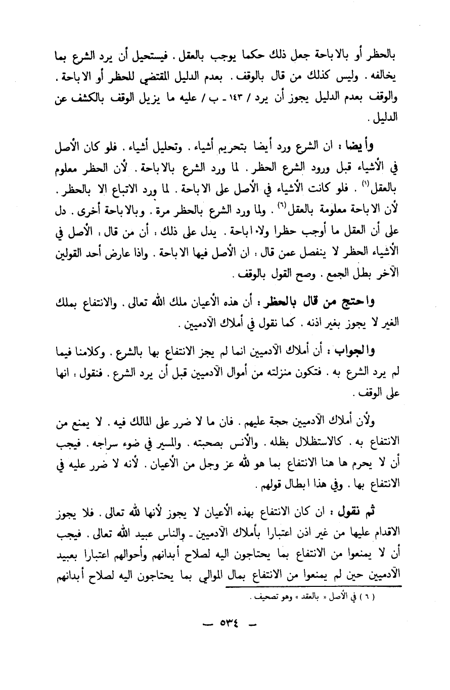 وَأَيْضًا إِن الشَّرْع ورد أَيْضا بِتَحْرِيم أَشْيَاء وَتَحْلِيل أَشْيَاء فَلَو كَانَ الأَصْل فِي الْأَشْيَاء قبل وُرُود الشَّرْع الْحَظْر لما ورد الشَّرْع بِالْإِبَاحَةِ لِأَن الْحَظْر مَعْلُوم بِالْعقلِ فَلَو كَانَت الْأَشْيَاء فِي الأَصْل على الْإِبَاحَة لما ورد الِاتِّبَاع إِلَّا بالحظر لِأَن الْإِبَاحَة مَعْلُومَة بِالْعقلِ وَلما ورد الشَّرْع بالحظر مرّة وبالإباحة أُخْرَى دلّ على أَن الْعقل مَا أوجب حظرا وَلَا إِبَاحَة يدل على ذَلِك أَن من قَالَ الأَصْل فِي الْأَشْيَاء الْحَظْر لَا ينْفَصل عَمَّن قَالَ إِن الأَصْل فِيهَا الْإِبَاحَة وَإِذا عَارض أحد الْقَوْلَيْنِ الآخر بَطل الْجمع وَصَحَّ القَوْل بِالْوَقْفِ