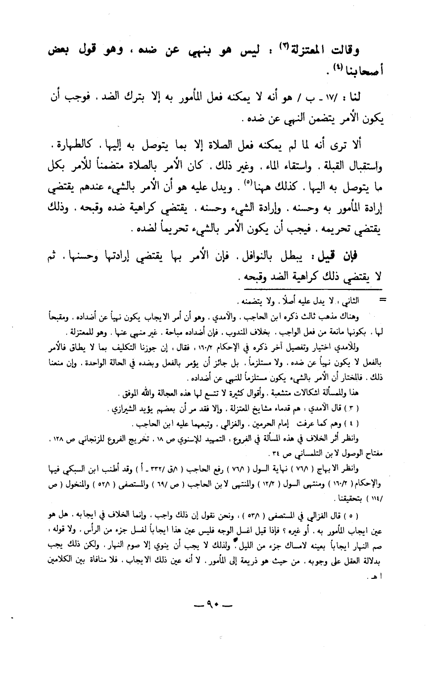 أَلا ترى أَنه لما لم يُمكنهُ فعل الصَّلَاة إِلَّا بِمَا يتَوَصَّل بِهِ إِلَيْهَا كالطهارة واستقبال الْقبْلَة واستقاء المَاء وَغير ذَلِك كَانَ الْأَمر بِالصَّلَاةِ متضمنا لِلْأَمْرِ بِكُل مَا يتَوَصَّل بِهِ إِلَيْهَا كَذَلِك هَهُنَا وَيدل عَلَيْهِ هُوَ أَن الْأَمر بالشَّيْء عِنْدهم يَقْتَضِي إِرَادَة الْمَأْمُور بِهِ وَحسنه وَإِرَادَة الشَّيْء وَحسنه يَقْتَضِي كَرَاهِيَة ضِدّه وقبحه وَذَلِكَ يَقْتَضِي تَحْرِيمه فَيجب أَن يكون الْأَمر بالشَّيْء تَحْرِيمًا لضده