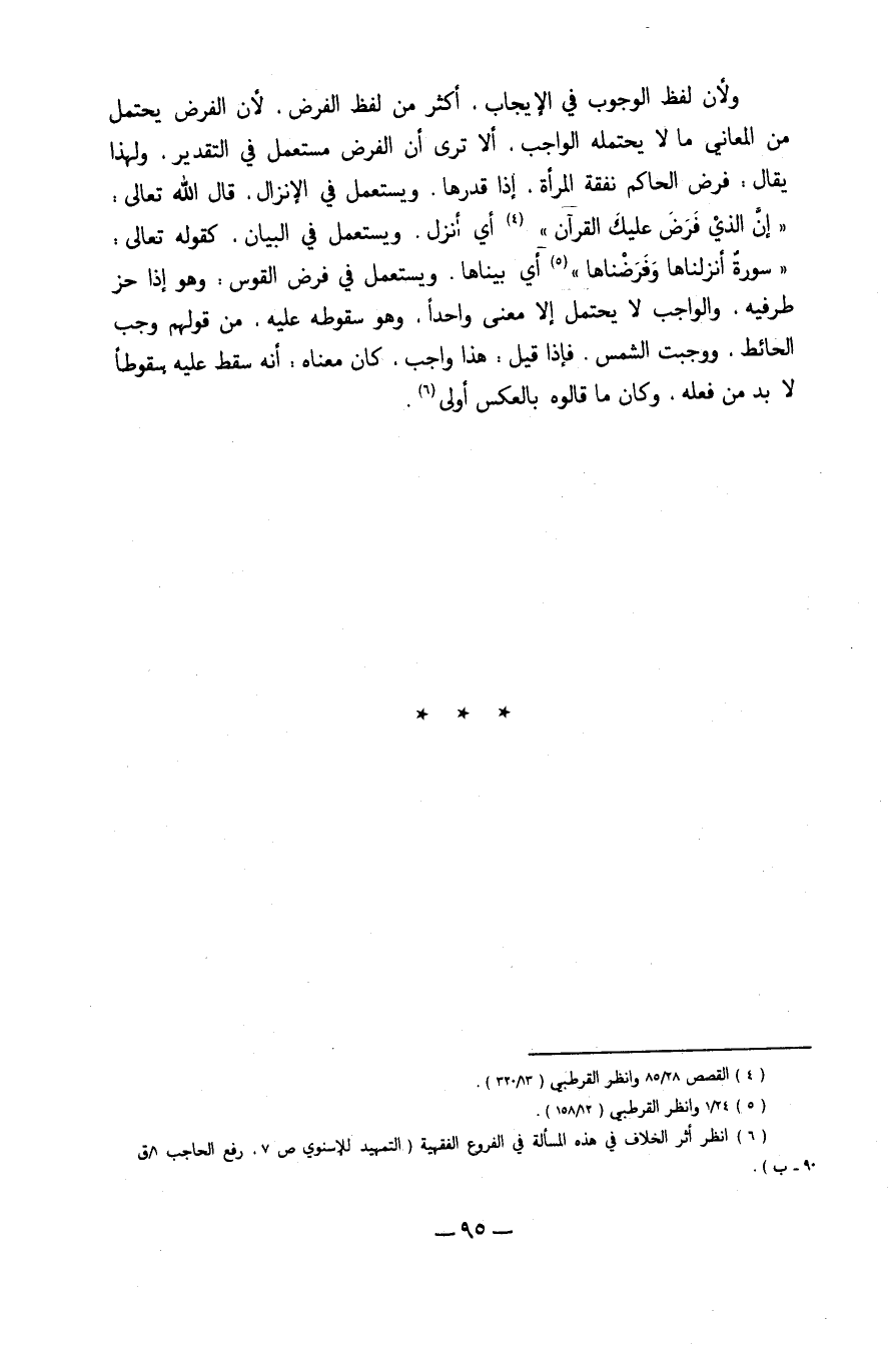 وَلِأَن لفظ الْوُجُوب فِي الْإِيجَاب أَكثر من لفظ الْفَرْض لِأَن الْفَرْض يحْتَمل من الْمعَانِي مَا لَا يحْتَملهُ الْوَاجِب أَلا ترى أَن الْفَرْض مُسْتَعْمل فِي التَّقْدِير وَلِهَذَا يُقَال فرض الْحَاكِم نَفَقَة الْمَرْأَة إِذا قدرهَا وَيسْتَعْمل فِي الْإِنْزَال قَالَ الله تَعَالَى {إِن الَّذِي فرض عَلَيْك الْقُرْآن} أَي أنزل وَيسْتَعْمل فِي الْبَيَان كَقَوْلِه تَعَالَى {سُورَة أنزلناها وفرضناها} أَي بيناها وَيسْتَعْمل فِي فرض الْقوس وَهُوَ إِذا حز طَرفَيْهِ وَالْوَاجِب لَا يحْتَمل إِلَّا معنى وَاحِدًا وَهُوَ سُقُوطه عَلَيْهِ من قَوْلهم وَجب الْحَائِط وَوَجَبَت الشَّمْس فَإِذا قيل هَذَا وَاجِب كَانَ مَعْنَاهُ أَنه سقط عَلَيْهِ سقوطا لَا بُد من فعله وَكَانَ مَا قَالُوهُ بِالْعَكْسِ أولى