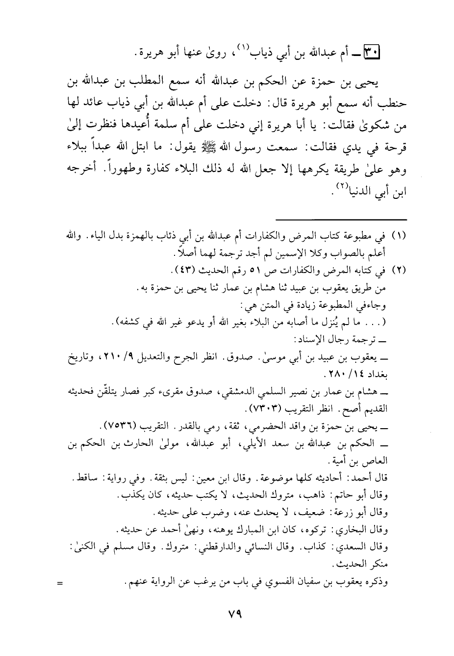 30 - أم عبد الله بن أبي ذياب روى عَنْهَا أَبُو هُرَيْرَة يحيى بن حَمْزَة عَن الحكم بن عبد الله أَنه سمع الْمطلب بن عبد الله بن حنْطَب أَنه سمع أَبُو هُرَيْرَة قَالَ دخلت على أم عبد الله بن أبي ذياب عَائِد لَهَا من شكوى فَقَالَت يَا أَبَا هُرَيْرَة إِنِّي دخلت على أم سَلمَة أعيدها فَنَظَرت إِلَى قرحَة فِي يَدي فَقَالَت سَمِعت رَسُول الله صلى الله عَلَيْهِ وَسلم يَقُول مَا ابتل الله عبدا ببلاء وَهُوَ على طَريقَة يكرهها إِلَّا جعل الله لَهُ ذَلِك الْبلَاء كَفَّارَة وَطهُورًا أخرجه ابْن أبي الدُّنْيَا