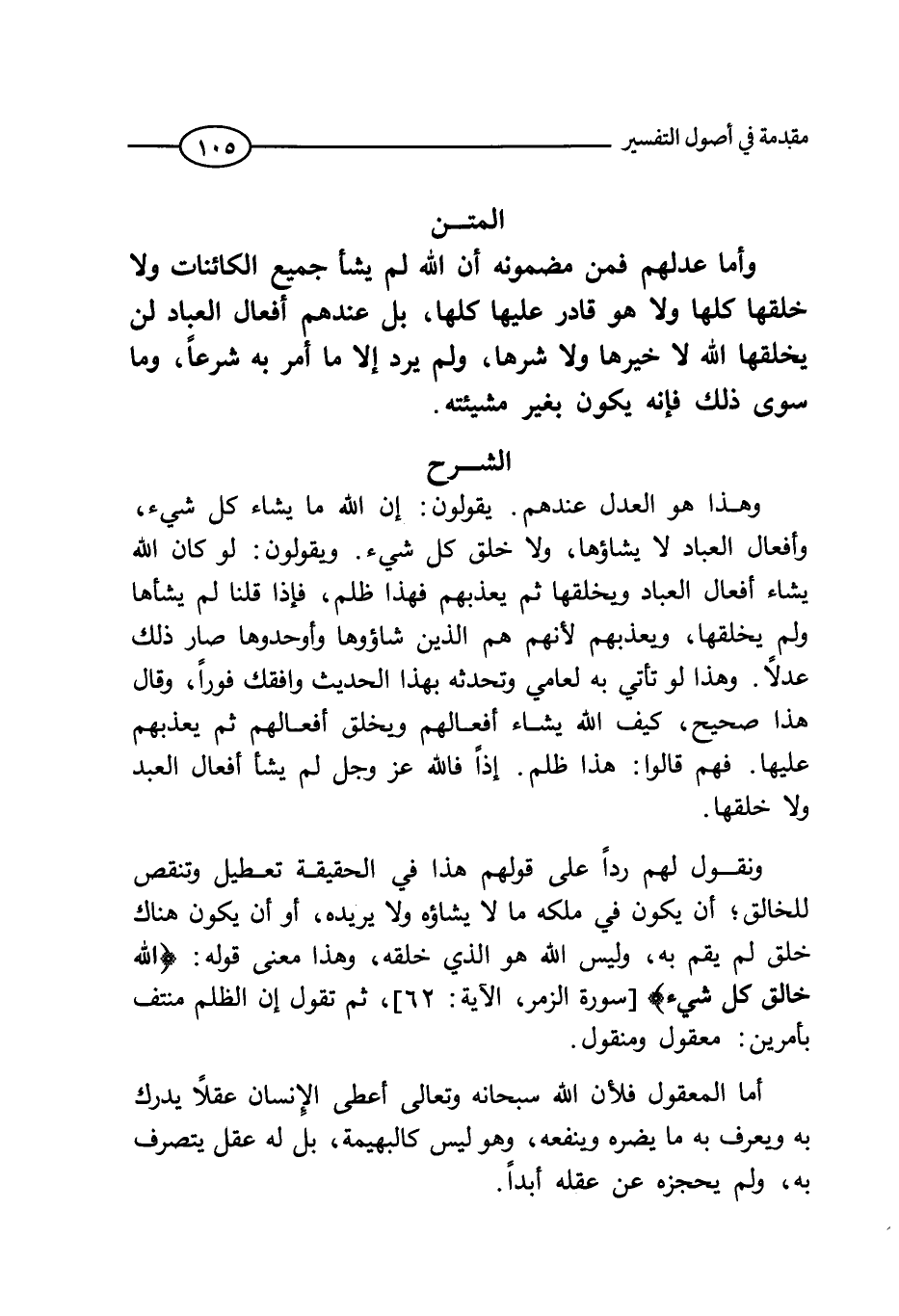 وهذا هو العدل عندهم. يقولون: إن الله لا يشاء كل شيء، وأفعال العباد لا يشاؤها، ولا خلق كل شيء. يقولون: لو كان الله يشاء أفعال العباد ويخلقها ثم يعذبهم فهذا ظلم، فإذا قلنا لم يشاؤه ولم يخلقها، ويعذبهم لأنهم هم الذين شاؤوها أوجدها صار ذلك عدلا. وهذا لو تأتي به لعامي وتحدثه بهذا الحديث وافقك فورا، وقال هذا صحيح، كيف الله يشاء أفعالهم ويخلق أفعالهم ثم يعذبهم عليها، فهم قالوا: هذا ظلم. إذا فالله عز وجل لم يشأ أفعال العبد ولا خلقها.