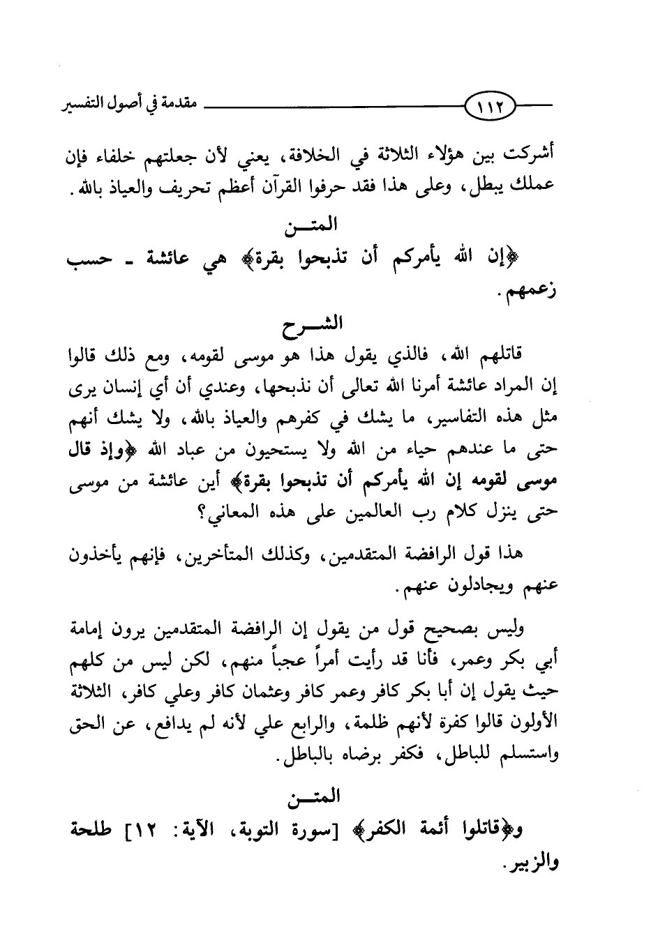 قاتلهم الله، فالذي يقول هذا هو موسى لقومه، ومع ذلك قالوا: إن المراد عائشة أمرنا الله تعالى أن نذبحها، وعندي أن أي إنسان يرى مثل هذه التفاسير، لا يشك في كفرهم والعياذ بالله، ولا يشك أنهم حتى ما عندهم حياء من الله ولا يستحيون من عباد الله (وَإِذْ قَالَ مُوسَى لِقَوْمِهِ إِنَّ اللَّهَ يَأْمُرُكُمْ أَنْ تَذْبَحُوا بَقَرَةً) (البقرة: 67) ، أين عائشة من موسى حتى ينزل كلام رب العالمين على هذه المعاني؟