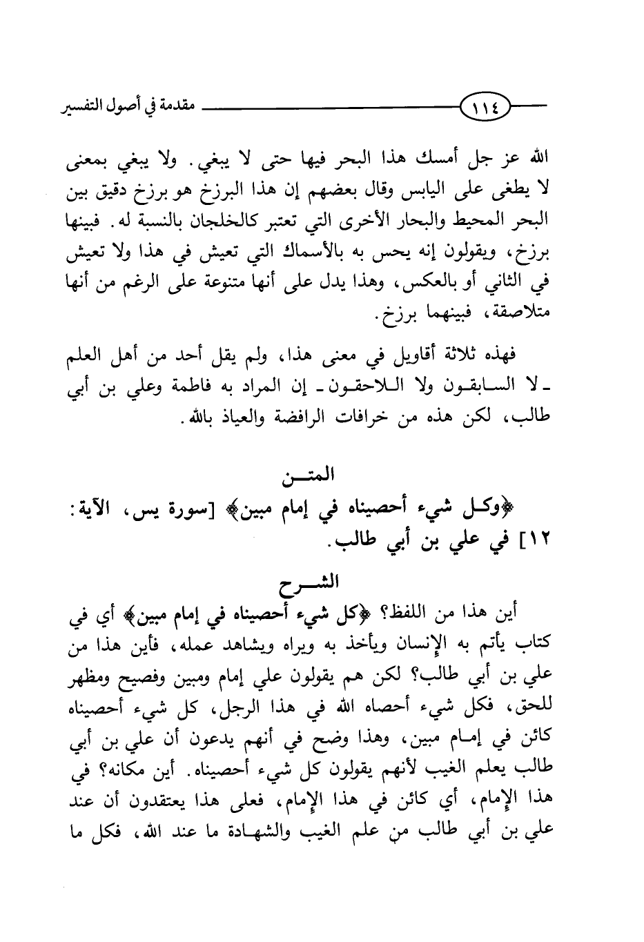 أين هذا من اللفظ؟ (وَكُلَّ شَيْءٍ أَحْصَيْنَاهُ فِي إِمَامٍ مُبِينٍ) أي في كتاب يأتم به الإنسان ويأخذ به ويراه ويشاهد عمله، فأين هذا من علي بن أبي طالب؟ لكن هم يقولون علي إمام ومبين وفصيح ومظهر للحق، فكل شيء أحصاه الله في هذا الرجل، وكل شيء أحصيناه في إمام مبين، وهذا واضح في أنهم يدعون أن علي بن أبي طالب يعلم الغيب؛ لأنهم يقولون كل شيء أحصيناه وأين مكانه؟ في هذا الإمام، أي كائن في هذا الإمام، فعلى هذا يعتقدون أن عند علي بن أبي طالب من علم الغيب والشهادة ما عند الله، فكل ما