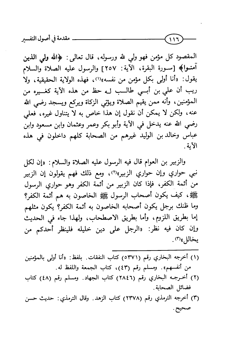 والزبير بن العوم قال فيه الرسول عليه الصلاة والسلام: ((إن لكل نبي حواري وإن حواري الزبير (¬2) ، ومع ذلك فهم يقولون إن الزبير من أئمة الكفر، فإذا كان الزبير من أئمة الكفر وهو حواري الرسول صلى الله عليه وسلم، فكيف يكون أصحاب الرسول صلي الله عليه وسلم الخاصون به هم أئمة الكفر؟ وما ظنك برجل يكون أصحابه الخاصون به أئمة الكفر؟ يكون مثلهم إما بطريق اللزوم، وإما بطريق الاصطحاب، ولهذا جاء في الحديث وإن كان فيه نظر: ((الرجل على دين خليله فلينظر أحدكم من يخالل)) (¬3) .
