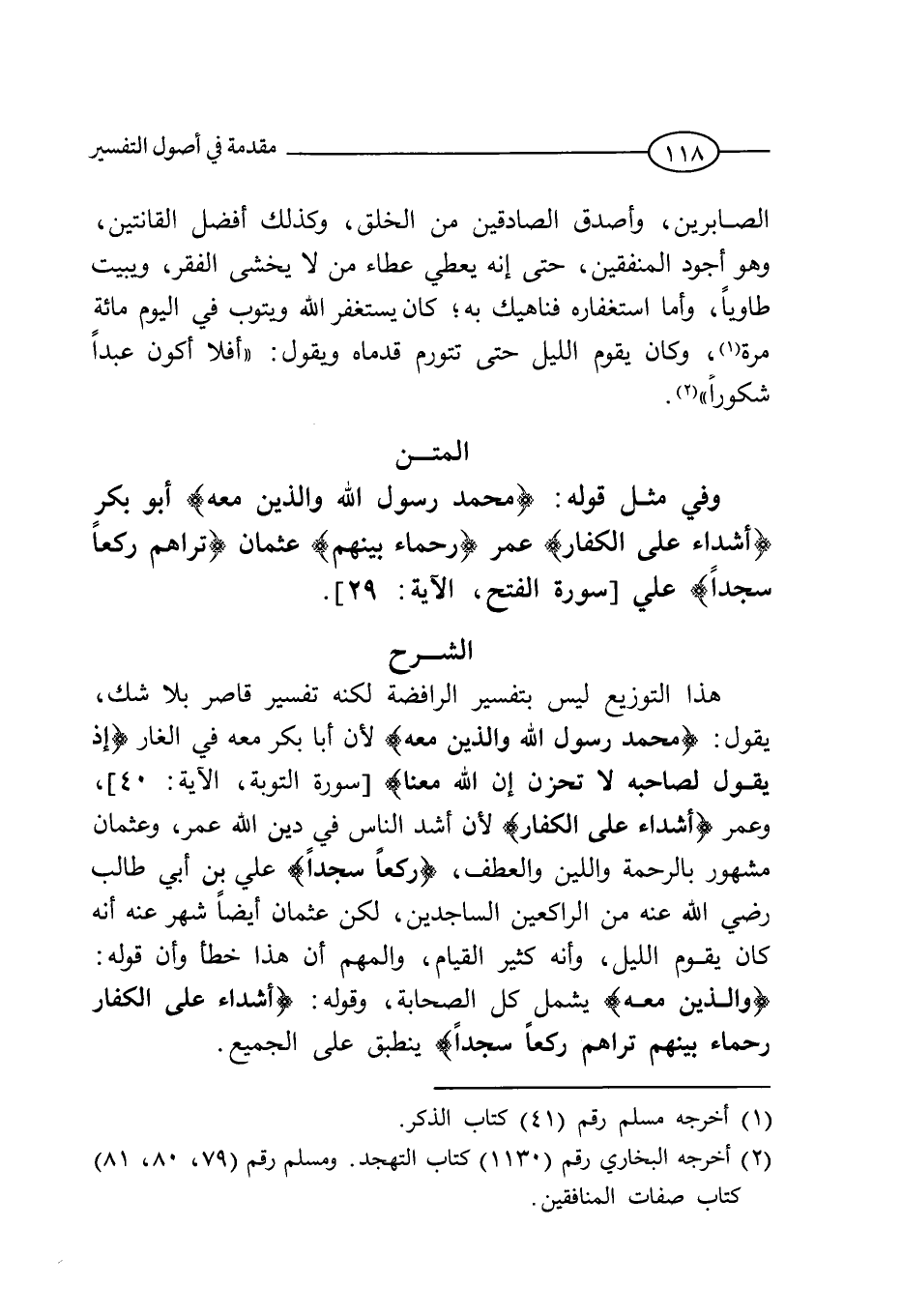 وهذا التوزيع ليس بتفسير الرافضة لكنه تفسير قاصر بلا شك، يقول: (مُحَمَّدٌ رَسُولُ اللَّهِ وَالَّذِينَ مَعَهُ) لأن ابا بكر معه في الغار (إِذْ يَقُولُ لِصَاحِبِهِ لا تَحْزَنْ إِنَّ اللَّهَ مَعَنَا) (التوبة: 40) وعمر، (أَشِدَّاءُ عَلَى الْكُفَّارِ لأن اشد الناس في دين الله عمر، وعثمان مشهور بالرحمة واللين والعطف، (رُكَّعاً سُجَّداً) وعلى بن أبي طالب رضي الله عنه من الراكعين الساجدين، لكن عثمان أيضاً شهر عنه أنه كان يقوم الليل، وأنه كثير القيام.