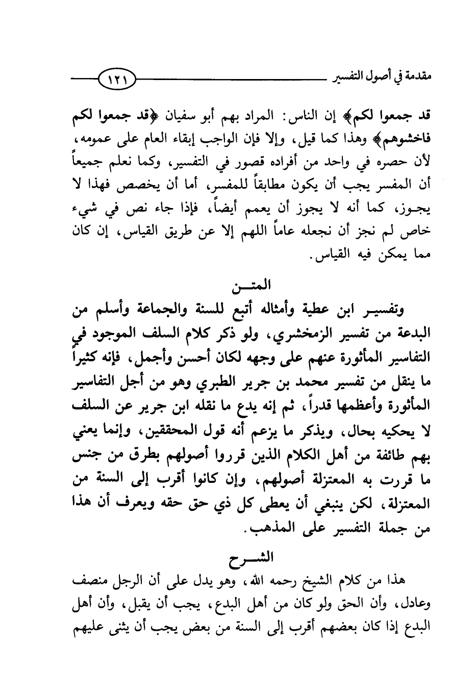 قَدْ جَمَعُوا لَكُمْ) أن الناس المراد بهم أبو سفيان (قَدْ جَمَعُوا لَكُمْ فَاخْشَوْهُمْ) وهذا كما قيل، وإلا فإن الواجب إبقاء العم على عمومه لأن حصره في واحد من أفراده قصور في التفسير، وكما نعلم جميعاً أن المفسر يجب أن يكون مطابقاً للمفسر، أما أن يخصص فهذا لا يجوز، كما أنه لا يجوز أن يعم أيضاً، فإذا جاء نص في شيء خاص لم يجز أن نجعله عاما اللهم إلا عن طريق القياس، إن كان مما يمكن فيه القياس.