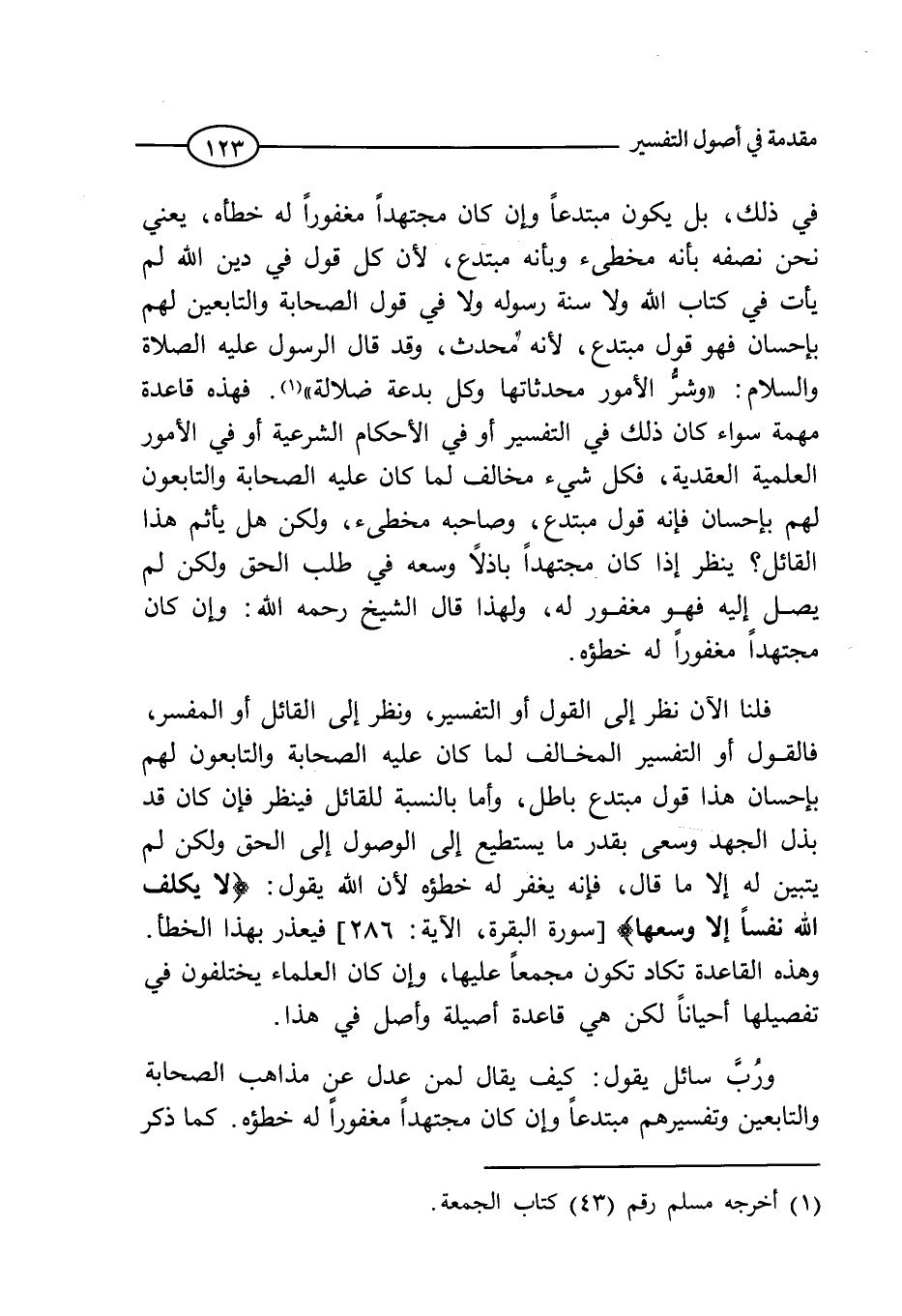 ورب سائل يقول: كيف يقال لمن عدل عن مذاهب الصحابة والتابعين وتفسيرهم مبتدعاً وإن كان مجتهداً مغفوراً له خطؤه. كما ذكر