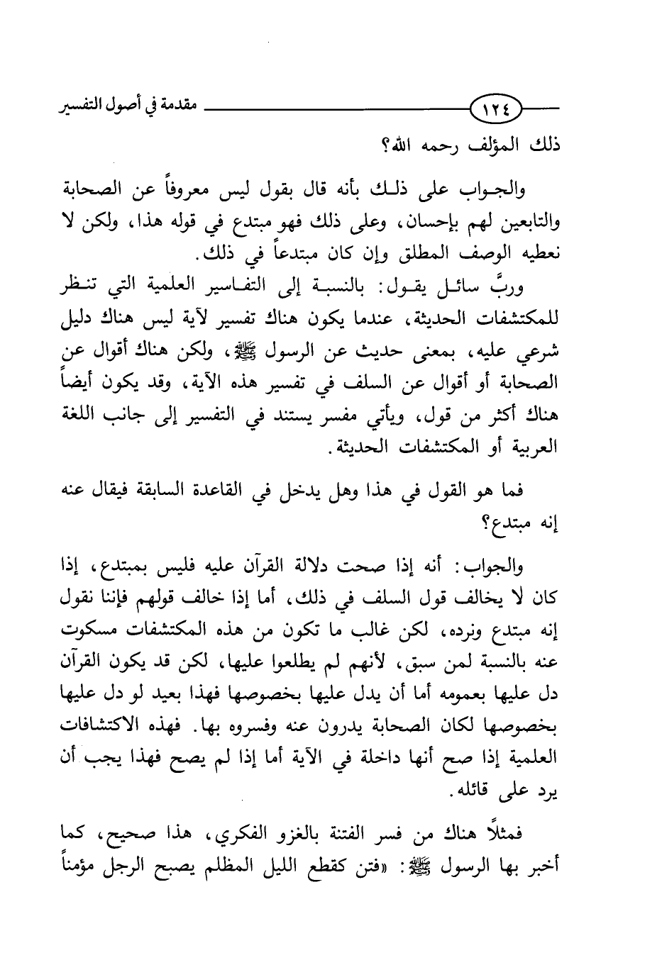 ورب سائل يقول: بالنسبة إلي التفاسير العلمية التي تنظر للمكتشفات الحديثة، عندما يكون هناك تفسير لآية ليس هناك دليل شرعي عليه، بمعني حديث عن الرسول صلى الله عليه وسلم، ولكن هنا أقوال عن الصحابة أو أقوال عن السلف في تفسير هذه الآية، وقد يكون أيضاً هناك أكثر من قول، ويأتي مفسر يستند في التفسير إلي جانب اللغة العربية أو المكتشفات الحديثة. فما هو القول في هذا؟ وهل يدخل في القاعدة السابقة فيقال عنه إنه مبتدع؟