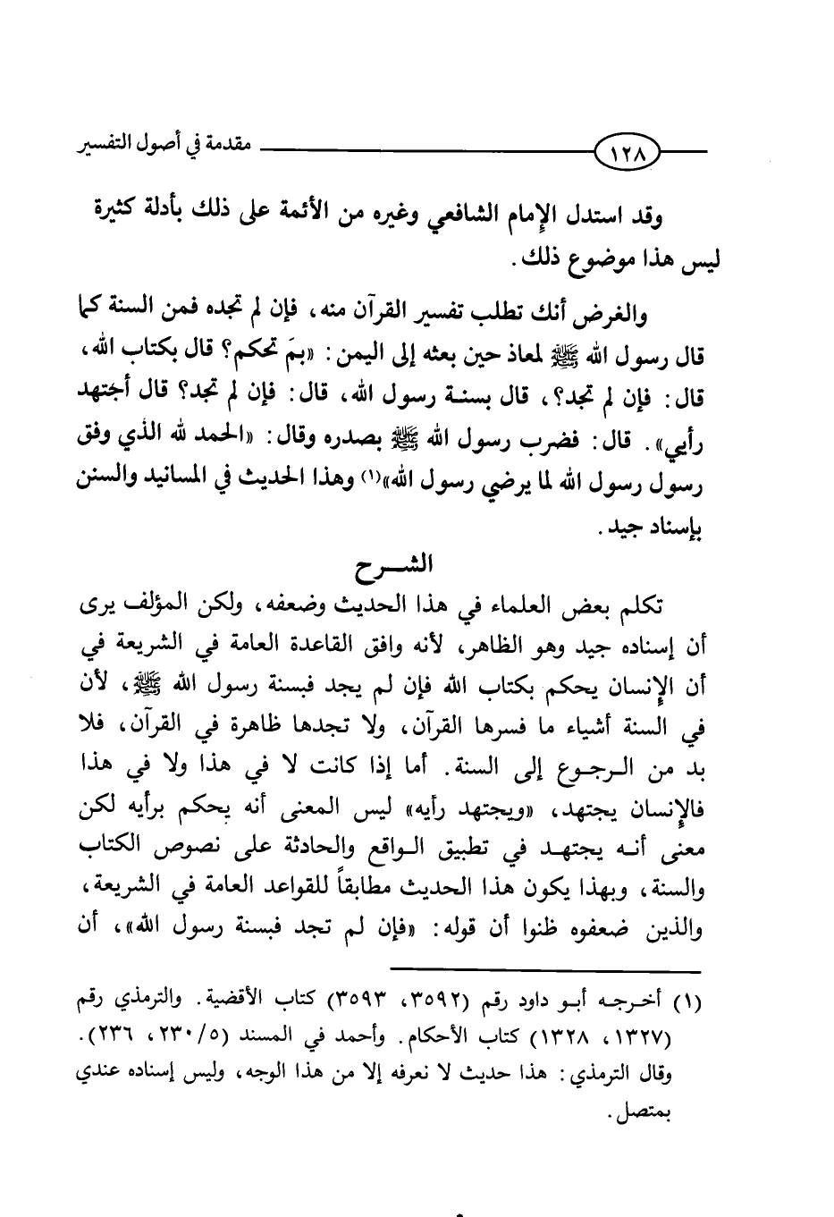 تكلم بعض العلماء على هذا الحديث وضعفه، ولكن المؤلف يرى أن إسناده جيد وهو الظاهر، لأنه وافق القاعدة العامة في الشريعة في أن الإنسان يحكم بكتاب الله، فإن لم يجد فبسنة رسول الله صلى الله عليه وسلم؛ لأن في السنة أشياء لم يفسرها القرآن، ولا تجدها ظاهرة في القرآن، فلابد من الرجوع إلى السنة. أما إذا كانت لا في هذا ولا في هذا فالإنسان ((يجتهد رأيه)) وليس المعنى أنه يحكم برأيه، لكن المعنى أن يجتهد في تطبيق الواقعة والحادثة على نصوص الكتاب والسنة، وبهذا يكون هذا الحديث مطابقاً للقواعد العامة في الشريعة، والذين ضعفوه ظنوا أن قوله: ((فإن لم تجد فبسنة رسول الله)) ، أن