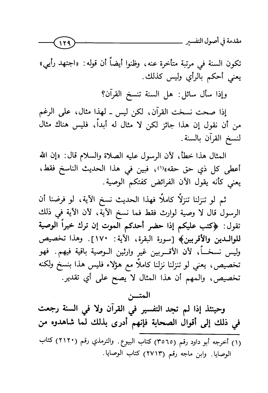 ثم لو تنزلنا تنزيلاً كاملاً فهذا الحديث لم ينسخ الآية، ولو فرضنا أن الرسول قال لا وصية لوارث فقط فما نسخ الآية، لأن الآية في ذلك تقول: (كُتِبَ عَلَيْكُمْ إِذَا حَضَرَ أَحَدَكُمُ الْمَوْتُ إِنْ تَرَكَ خَيْراً الْوَصِيَّةُ لِلْوَالِدَيْنِ وَالْأَقْرَبِينَ) (البقرة: 180) ، وهذا تخصيص وليس نسخاً؛ لأن الأقربين غير الوارثين الوصية باقية فيهم. فهو تخصيص، يعني لو تنزلنا تنزلاً كاملاً مع هؤلاء فليس هذا بنسخ ولكنه تخصيص، والمهم أن هذا المثال لا يصح علي أي تقدير.