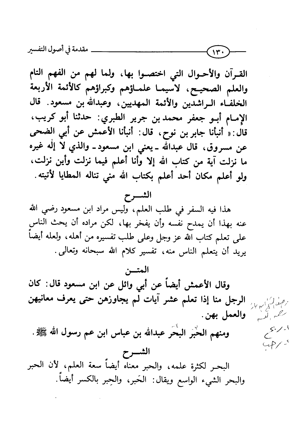القرآن والأحوال التي اختصوا بها، ولما لهم من الفهم التام والعلم الصحيح والعمل الصالح لا سيما علماؤهم وكبراؤهم؛ كالأئمة الأربعة الخلفاء الراشدين والأئمة المهديين، مثل عبد الله بن مسعود. قال الإمام أبو جعفر محمد بن جرير الطبري: حدثنا أبو كريب، قال: ((أنبانا جابر بن نوح، قال: أنبانا الأعمش عن أبي الضحى عن مسروق، قال عبد الله- يعني ابن مسعود- والذي لا إله غيره ما نزلت آية من كتاب الله إلا وأنا أعلم فيمن نزلت وأين نزلت، ولو أعلم مكان أحد أعلم بكتاب الله مني تناله المطايا لأتيته.