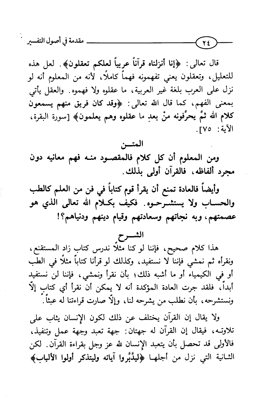 وأيضاً فالعادة تمنع أن يقرأ قوم كتاباً في فن من العلم، كالطب والحساب ولا يستشرحوه. فكيف بكلام الله تعالى الذي هو عصمتهم وبه نجاتهم وسعادتهم وقيام دينهم ودنياهم؟!