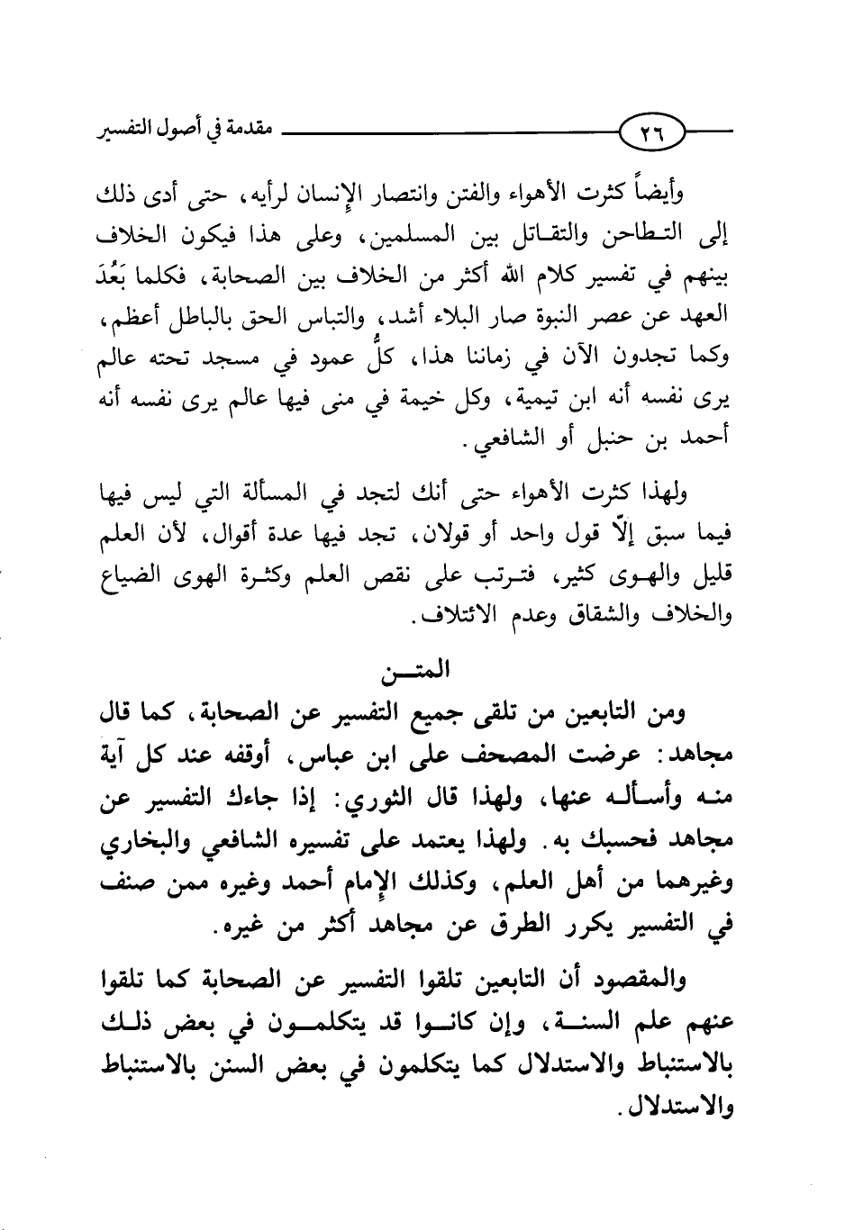وقد كثرت الأهواء والفتن وانتصار الإنسان لرأيه، حتى أدى ذلك إلي التطاحن والتقاتل بين المسلمين، وعلى هذا فيكون الخلاف بينهم في تفسير كلام الله أكثر من الخلاف بين الصحابة، ثم كلما بعد العهد عن عصر النبوة، صار البلاء أشد، والتباس بالباطل الحق أعظم، وكما نجد الآن في زماننا، كل عمود في مسجد تحته عالم يرى نفسه أنه ابن تيمية، وكل خيمة في مني فيها عالم يرى نفسه أنه أحمد بن جنبل أو الشافعي.