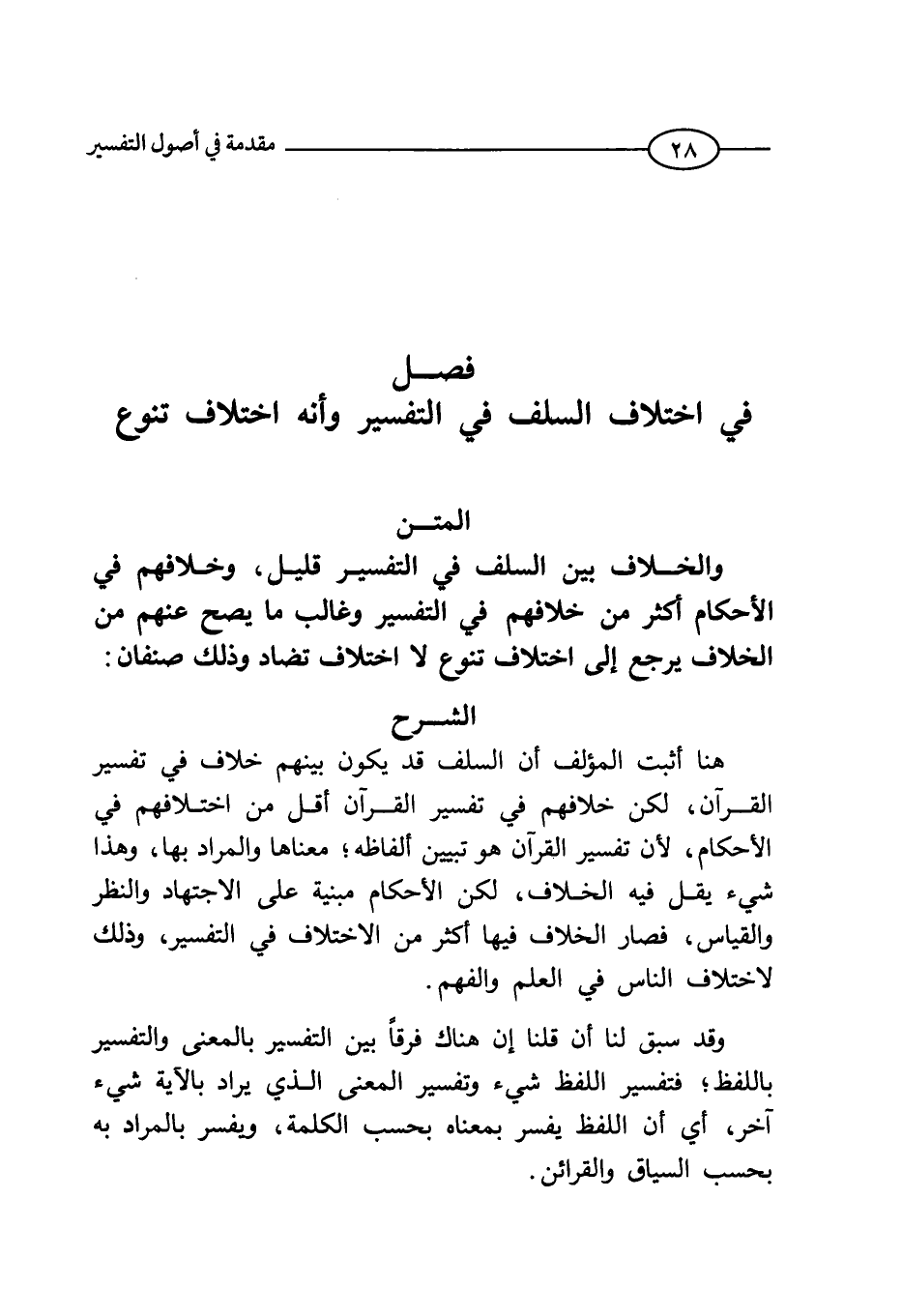 هنا أثبت المؤلف أن السلف قد يكون بينهم خلاف في تفسير القرآن، لكن خلافهم في تفسير القرآن أقل من خلافهم في الأحكام، لأن تفسير القرآن هو تبيين ألفاظه، معناها والمراد بهان وهذا شيء يقل فيه الخلاف، لكن الأحكام مبينة على الاجتهاد والنظر والقياس، فصار الاختلاف فيها أكثر من الاختلاف في التفسير، وذلك لاختلاف الناس في العلم والفهم.