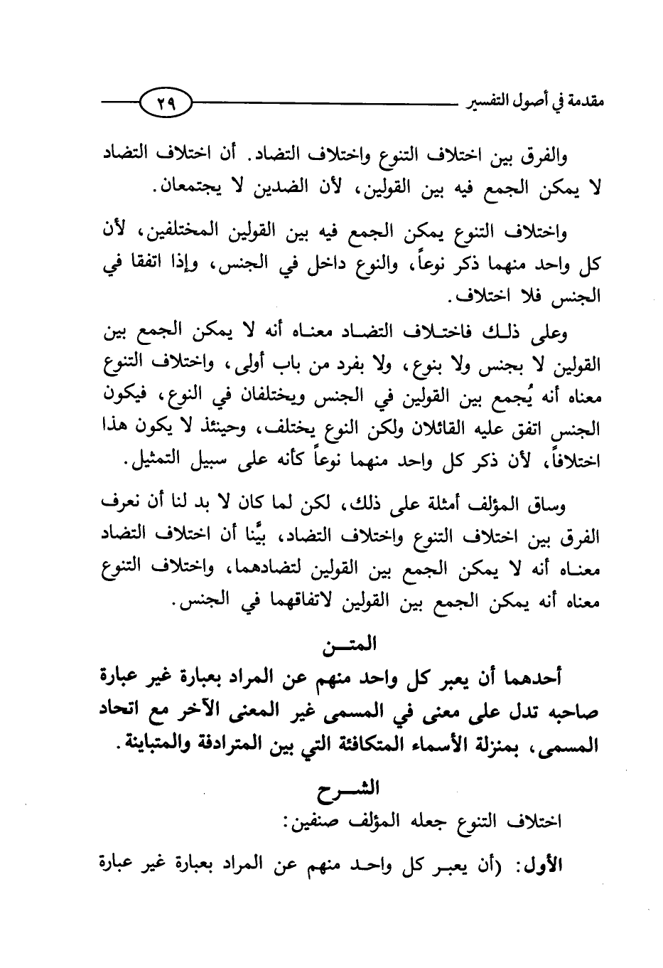 وعلى ذلك فاختلاف التضاد معناه أنه لا يمكن الجمع بين القولين لا بجنس ولا بنوع، ولا بفرد من باب أولى، واختلاف التنوع معناه أنه يجمع بين القولين في الجنس ويختلفان في النوع، فيكون الجنس اتفق عليه القائلان ولكن النوع يختلف، وحينئذ لا يكون هذا اختلافاً؛ لأن كل واحد منهما ذكر نوعاً كأنه على سبيل التمثيل.