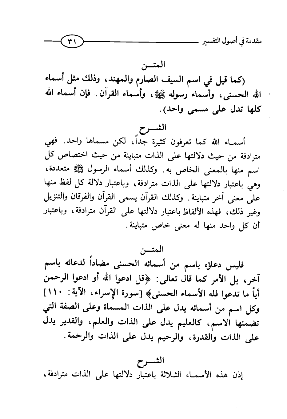 أسماء الله- تعالي- كثيرة جداً، لكن مسماها واحد. فهي مترادفة من حيث دلالتها على الذات متباينة من حيث اختصاص كل اسم منها بالمعني الخاص به وكذلك أسماء الرسول صلي الله عليه وسلم متعددة، فهي باعتبار دلالتها على الذات مترادفة، وباعتبار دلالة كل لفظ منها على معنى آخر متابينة. وكذلك القرآن يسمي القرآن، والفرقان، التنزيل وغير ذلك، فهذه الألفاظ باعتبار دلالتها على القرآن مترادفة، وباعتبار أن كل واحد منها له معني خاص متباينة.