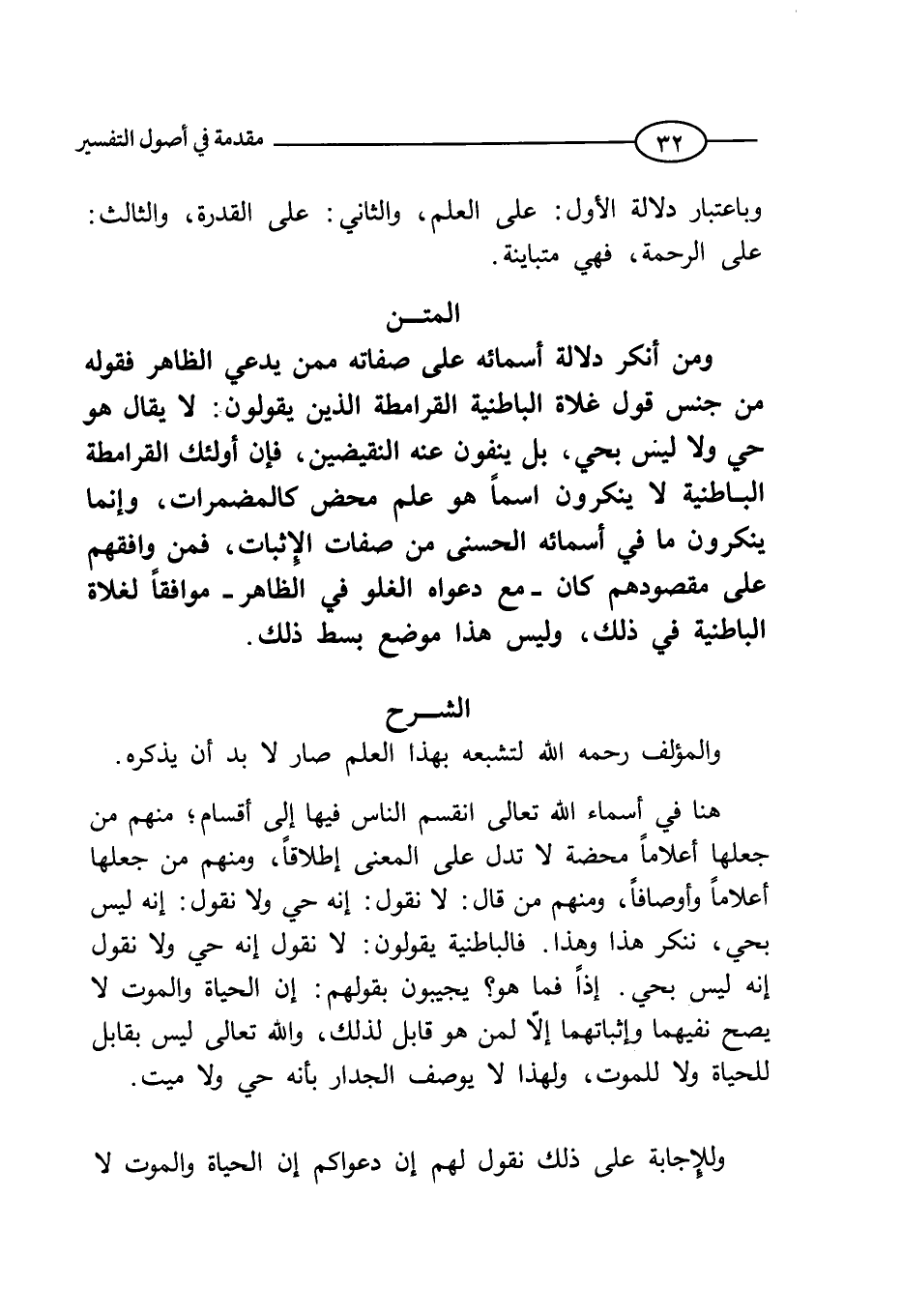 انقسم الناس في أسماء الله سبحانه وتعالي إلى أقسام فمنهم من جعلها أعلاماً محضة لا تدل على المعنى إطلاقاً، ومنهم من جعلها أعلاماً وأوصافاً، ومنهم من قال: لا نقول: إنه حي ولا نقول: إنه ليس بحي، فننكر هذا وهذا وهم الباطنية، ويجيبون بقولهم: إن الحياة والموت لا يصح نفيهما وإثباتهما إلا لمن هو قابل لذلك، والله تعالى ليس بقابل للحياة ولا للموت، ولهذا لا يوصف الجدار بأنه حي ولا ميت.