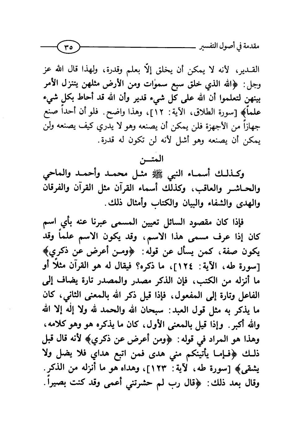 فإن كان مقصود السائل تعيين المسمى عبرنا عنه بأي اسم كان إذا عرف مسمي هذا الاسم، وقد يكون الاسم علماً وقد يكون صفة، كمن يسأل عن قوله: (وَمَنْ أَعْرَضَ عَنْ ذِكْرِي) (طه: 124) . ما ذكره؛ فيقال له: هو القرآن مثلاً، أو هو ما أنزله من الكتب، فإن الذكر مصدر، والمصدر تارة يضاف إلي الفاعل وتارة إلي المفعول، فإذا قيل: ذكر الله بالمعني الثاني، كان ما يذكر به مثل قول اعبد: سبحان الله، والحمد لله، ولا إله إلا الله والله أكبر. وإذا قيل بالمعني الأول، كان ما يذكره هو، وهو كلامه، وهذا هو المراد في قوله: (وَمَنْ أَعْرَضَ عَنْ ذِكْرِي) (طه: من الآية124) .
