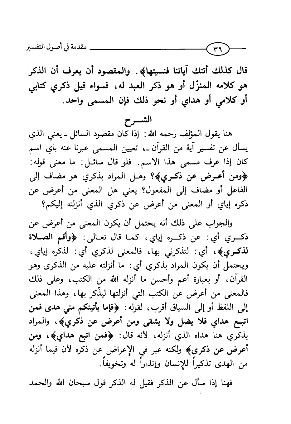 (قَالَ كَذَلِكَ أَتَتْكَ آيَاتُنَا فَنَسِيتَهَا) (طه::125، 126) ، والمقصود أن يعرف أن الذكر هو كلامه المنزل أو هو ذكر العبد له، فسواء قيل: ذكري: كتابي أو كلامي، أو هداي، أو نحو ذلك فإن المسمى واحد.