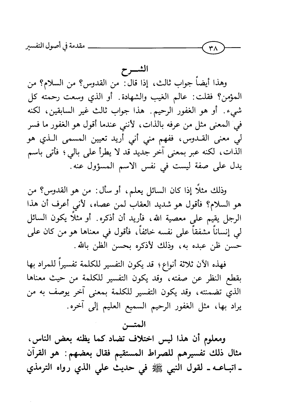 وهذا أيضاً جواب ثالث، إذا قال: من القدوس؟ من السلام؟ من المؤمن؟ فقلت: عالم الغيب والشهادة، أو الذي وسعت رحمته كل شيء، أو هو الغفور الرحيم، فهذا جواب ثالث غير السابقين، لكنه في المعنى مثل من عرفه بالذات؛ لأنني عندما أقول هو الغفور معناه ما (فسرت له) معني القدوس، ففهم مني أني أريد تعيين المسمى الذي هو الذات، لكن بمعنى آخر جديد قد لا يطرأ على باله، فأتيت باسم يدل على صفة ليست في نفس الاسم المسؤول عنه.
