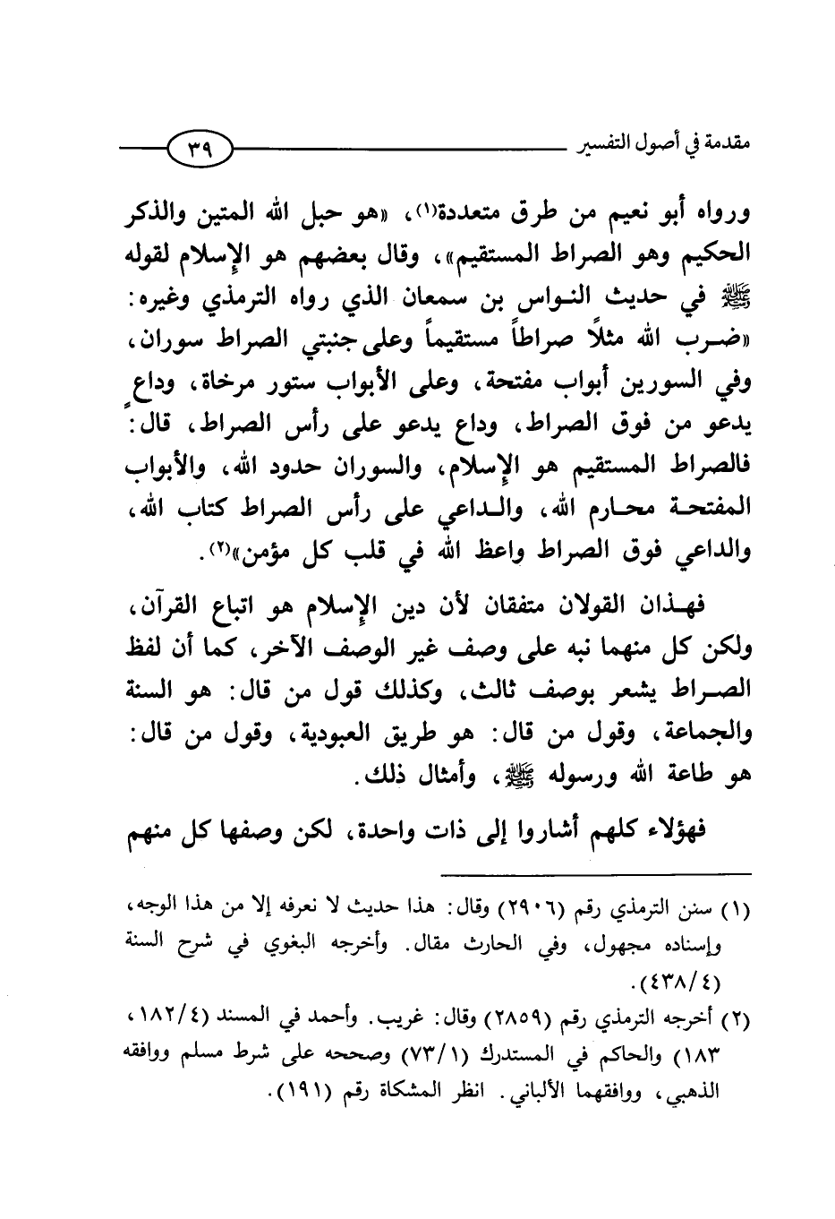 ورواه أبو نعيم من طرق متعددة (¬1) ، ((هو حبل الله المتين والذكر الحكيم وهو الصراط المستقيم)) وقال بعضهم هو الإسلام لقوله صلي الله عليه وسلم في حديث النواس بن سمعان الذي رواه الترمذي وغيره: ((ضرب الله مثلاً صراطاً مستقيماً وعلى جنتي الصراط سوران، وفي السورين أبواب مفتحة، وعلى الأبواب ستور مرخاة، وداعٍ يدعو من فوق الصراط، وداع يدعو على راس الصراط، قال: فالصراط المستقيم هو الإسلام، والسوران حدود الله، والأبواب المفتحة محارم الله، والداعي على رأس الصراط كتاب الله، والداعي فوق الصراط واعظ الله في قلب كل مؤمن)) (¬2) .