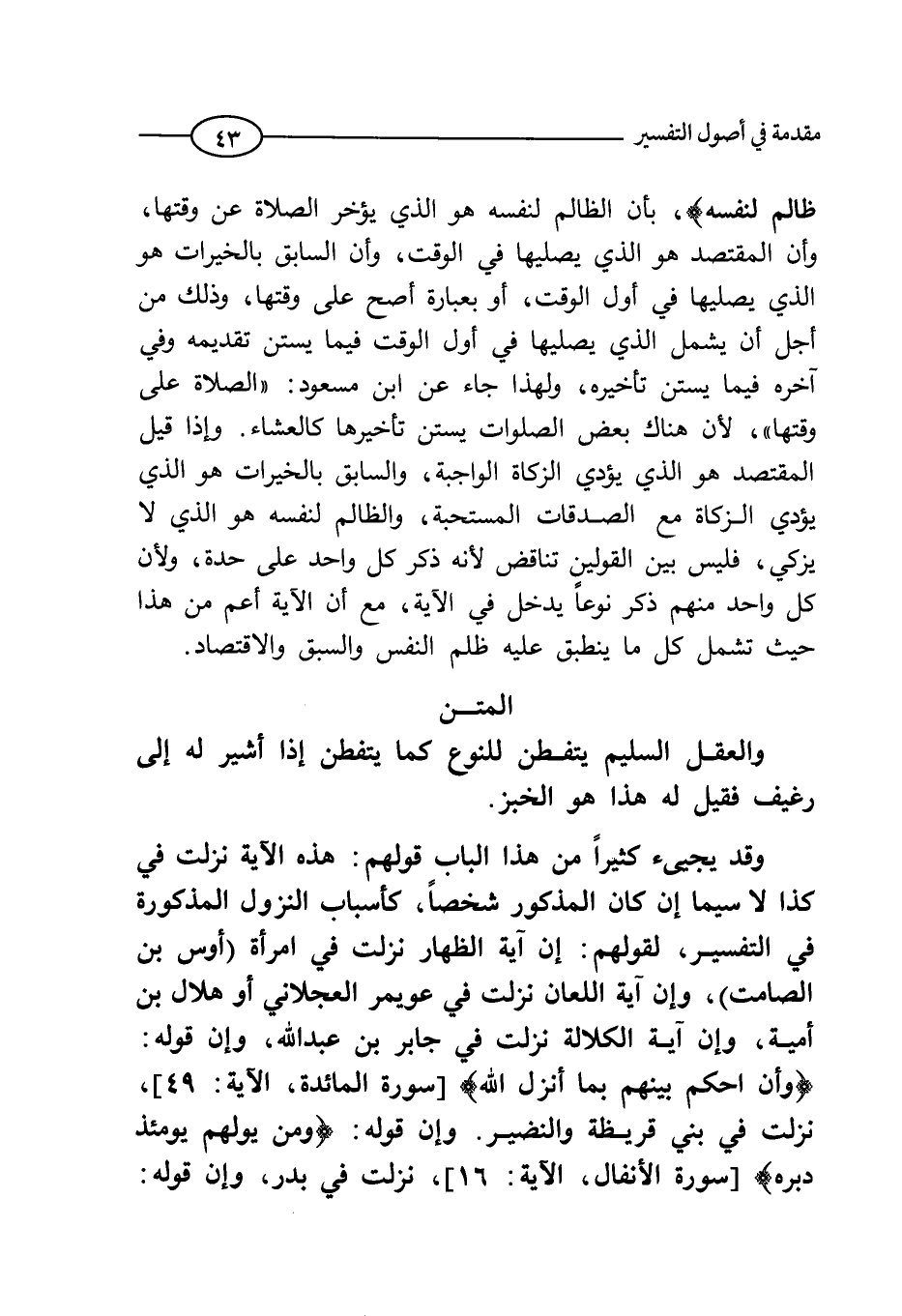 ظَالِمٌ لِنَفْسِهِ) ، بأن الظالم لنفسه هو الذي يؤخر الصلاة عن وقتها، وأن المقتصد هو الذي يصليها في الوقت، وأن السابق بالخيرات هو الذي يصليها في أول الوقت، أو بعبارة أصح على وقتها، وذلك من أجل أن يشمل الذي يصليها في أول الوقت فيما يسن تقديمه وفي آخره فيما يسن تأخيره، ولهذا جاء حديث ابن مسعود: ((الصلاة على وقتها)) (¬1) ؛ لأن هناك بعض الصلوات يسن تأخيرها كالعشاء.