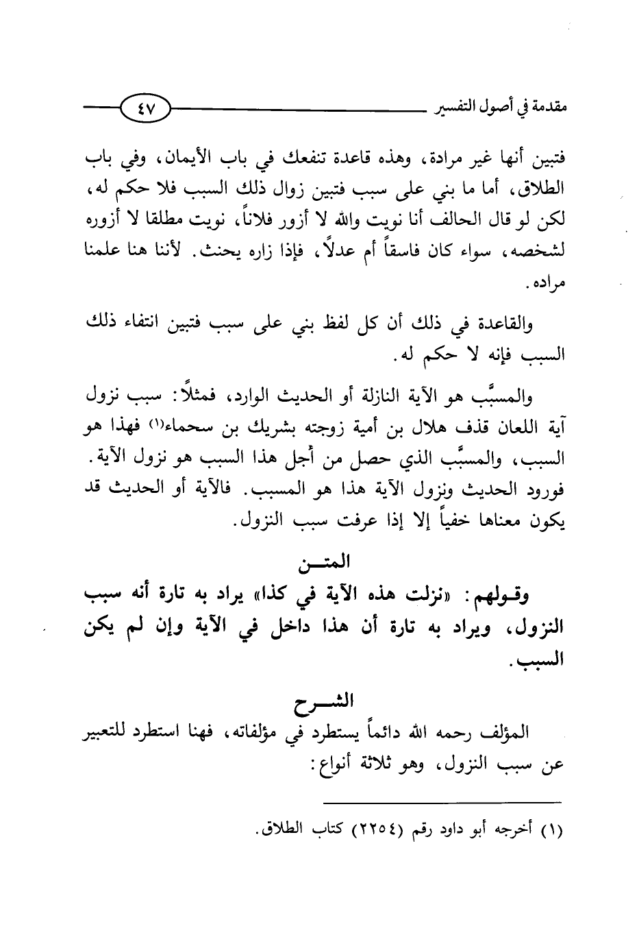 والمسبب هو الآية النازلة أو الحديث الوارد، فمثلاً: سبب نزول آية اللعان قذف هلال بن أمية زوجته بشريك بن سحماء (¬1) فهذا هو السبب، والمسبب الذي حصل من أجل هذا السبب هو نزول الآية. فورود الحديث ونزول الآية هذا هو المسبب. فالآية أو الحديث قد يكون معناها خفياً إلا إذا عرفت سبب النزول.