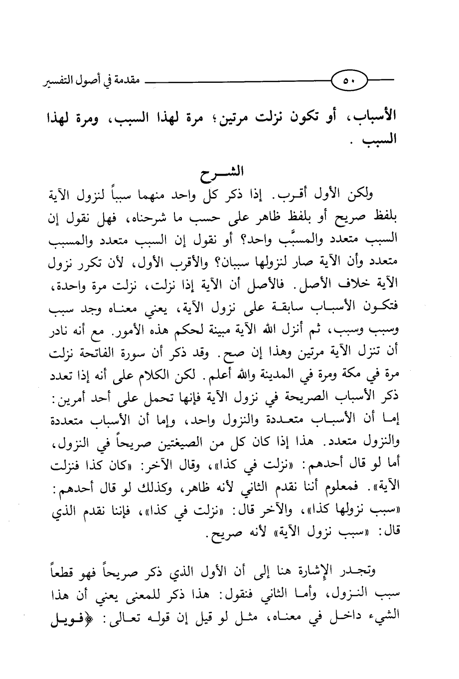 ولكن الأول أقرب، إذا ذكر كل واحد منهما سبباً لنزول الآية بلفظ صريح أو بلفظ ظاهر على حسب ما شرحناه، فهل نقول: إن السبب متعدد والمسبب واحد؟ أو نقول: إن السبب متعدد والمسبب متعدد وأن الآية صار لنزولها سببان؟ والأقرب الأول؛ لأن تكرر نزول الآية خلاف الأصل، فالأصل أن الآية إذا نزلت، نزلت مرة واحدة، فتكون الأسباب سابقة على نزول الآية، يعني معناه وجد سبب وسبب وسبب، ثم أنزل الله الآية مبينة لحكم هذه الأمور. مع أنه نادر أن تنزل الآية مرتين وهذا إن صح.
