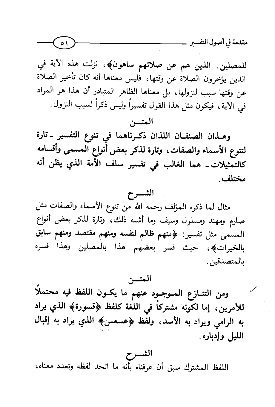 مثال لما ذكره المؤلف رحمه الله من تنوع الأسماء والصفات مثل صارم، ومهند، ومسلول، وسيف وما أشبه ذلك، وتارة لذكر بعض أنواع المسمى، مثل تفسير: (فَمِنْهُمْ ظَالِمٌ لِنَفْسِهِ وَمِنْهُمْ مُقْتَصِدٌ وَمِنْهُمْ سَابِقٌ بِالْخَيْرَاتِ) ، حيث فسر بعضهم هذا بالمصلين وهذا فسره بالمتصدقين..