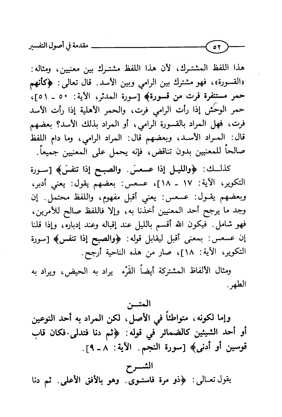 كذلك: (وَاللَّيْلِ إِذَا عَسْعَسَ) (17) (وَالصُّبْحِ إِذَا تَنَفَّسَ) (التكوير: 17، 18) ، عسعس: بعضهم يقول: يعني أدبر، وبعضهم يقول: عسعس يعني أقبل، واللفظ محتمل. إن وجد ما يرجح أحد المعنيين أخذنا به، وإلا قلنا اللفظ صالح للأمرين، فهو شامل. فيكون الله أقسم بالليل عند إقباله وعند إدباره وإذا قلنا عسعس: بمعني اقبل ليقابل قوله: (وَالصُّبْحِ إِذَا تَنَفَّسَ) (التكوير: 18) ، صار من هذه الناحية أرجح.
