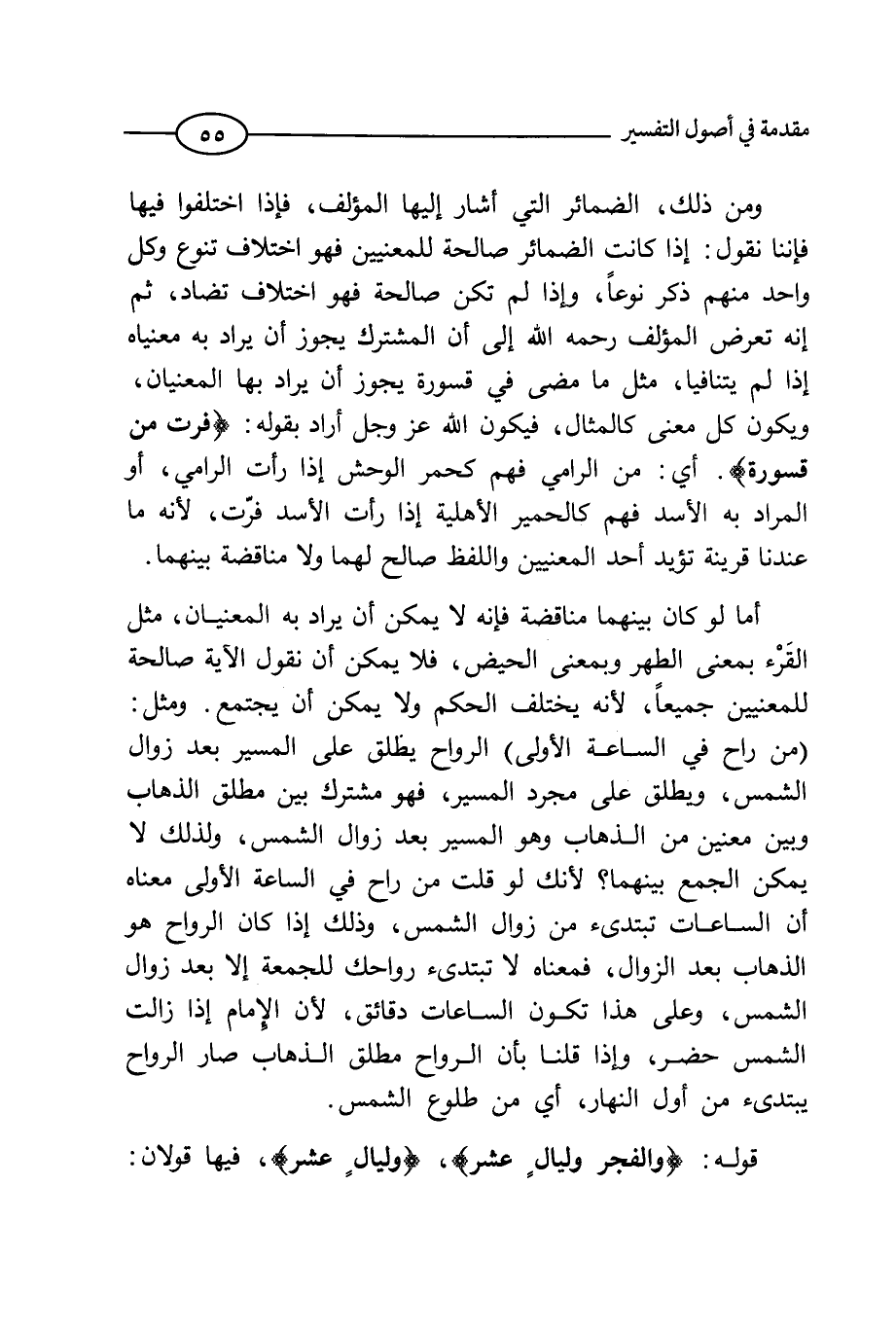 ومن ذلك، الضمائر التي أشار إليها المؤلف، فإذا اختلفوا فيها فإننا نقول: إذا كانت الضمائر صالحة للمعنيين، فهو اختلاف تنوع وكل واحد منهم ذكر نوعا، وإذا لم تكن صالحة، فهو اختلاف تضاد، ثم إنه تعرض المؤلف -رحمه الله -إلى أن المشترك هل يجوز أن يراد به معنياه؟ والصواب أنه يجوز أن يراد به معنياه إذا لم يتنافيا، مثل ما مضي في (قسورة) يجوز أن يراد بها المعنيان، ويكون كل معنى كالمثال، فيكون الله عز وجل أراد بقوله: (فَرَّتْ مِنْ قَسْوَرَةٍ) . أي: من الرامي فهم كحمر الوحش إذا رأت الرامي، أو المراد به الأسد فهم كالحمير الأهلية إذا رأت الأسد فرت، لأنه ليس عندنا قرينة تؤيد أحد المعنيين واللفظ صالح لهما ولا مناقضة بينهما.