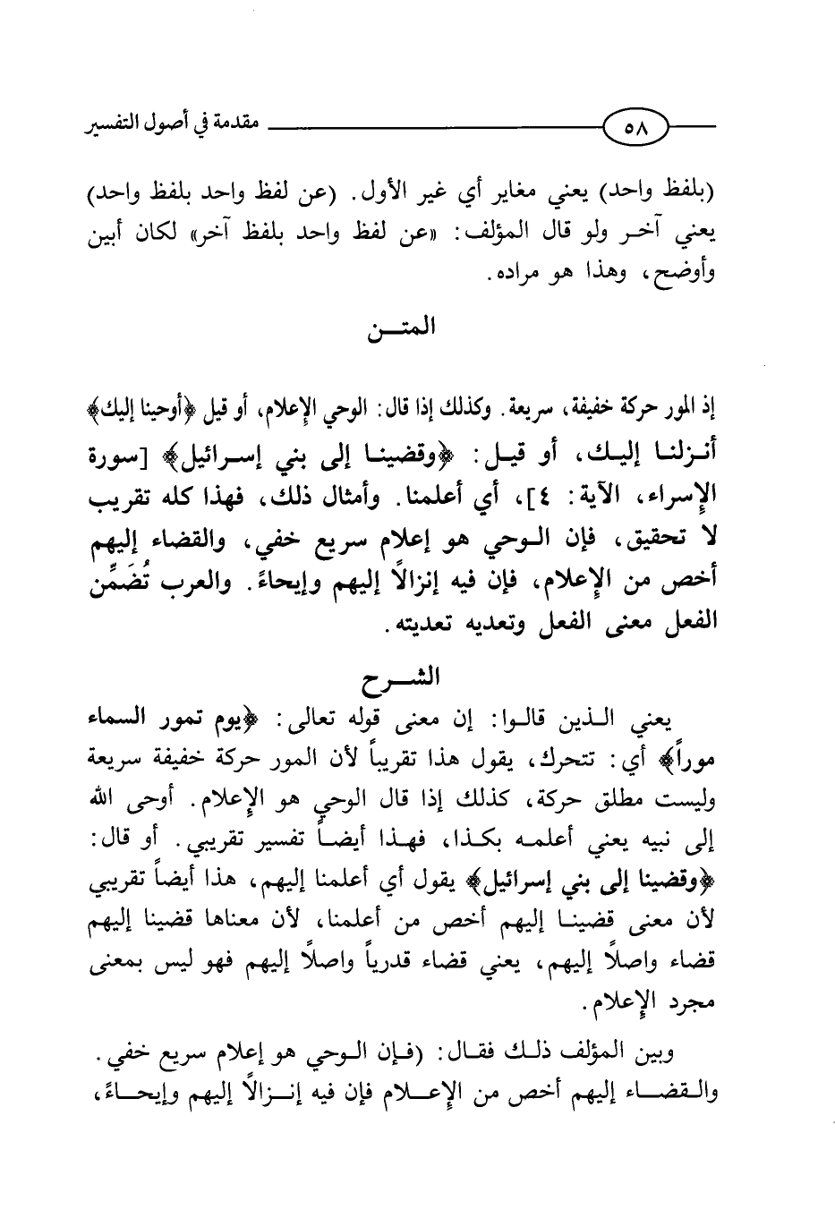 يعنى الذين قالوا: إن معنى قوله تعالي: (يَوْمَ تَمُورُ السَّمَاءُ مَوْراً) أي: تتحرك، يقول هذا تقريباً، لأن المور حرك خفيفة سريعة وليست مطلق حركة، كذلك إذا قال الوحي هو الإعلام. أوحى الله إلى نبيه يعني أعلمه بكذا، فهذا أيضاً تفسير تقريبي، أو قال: (وَقَضَيْنَا إِلَى بَنِي إِسْرائيل) يقول: أي أعلمنا إليهم، هذا أيضاً تقريبي؛ لأن معني قضينا إليهم أخص من أعلمنا؛ لأن معناها قضينا إليهم، يعني قضاء قدرياً واصلاً إليهم فهو ليس بمعنى مجرد الإعلام.