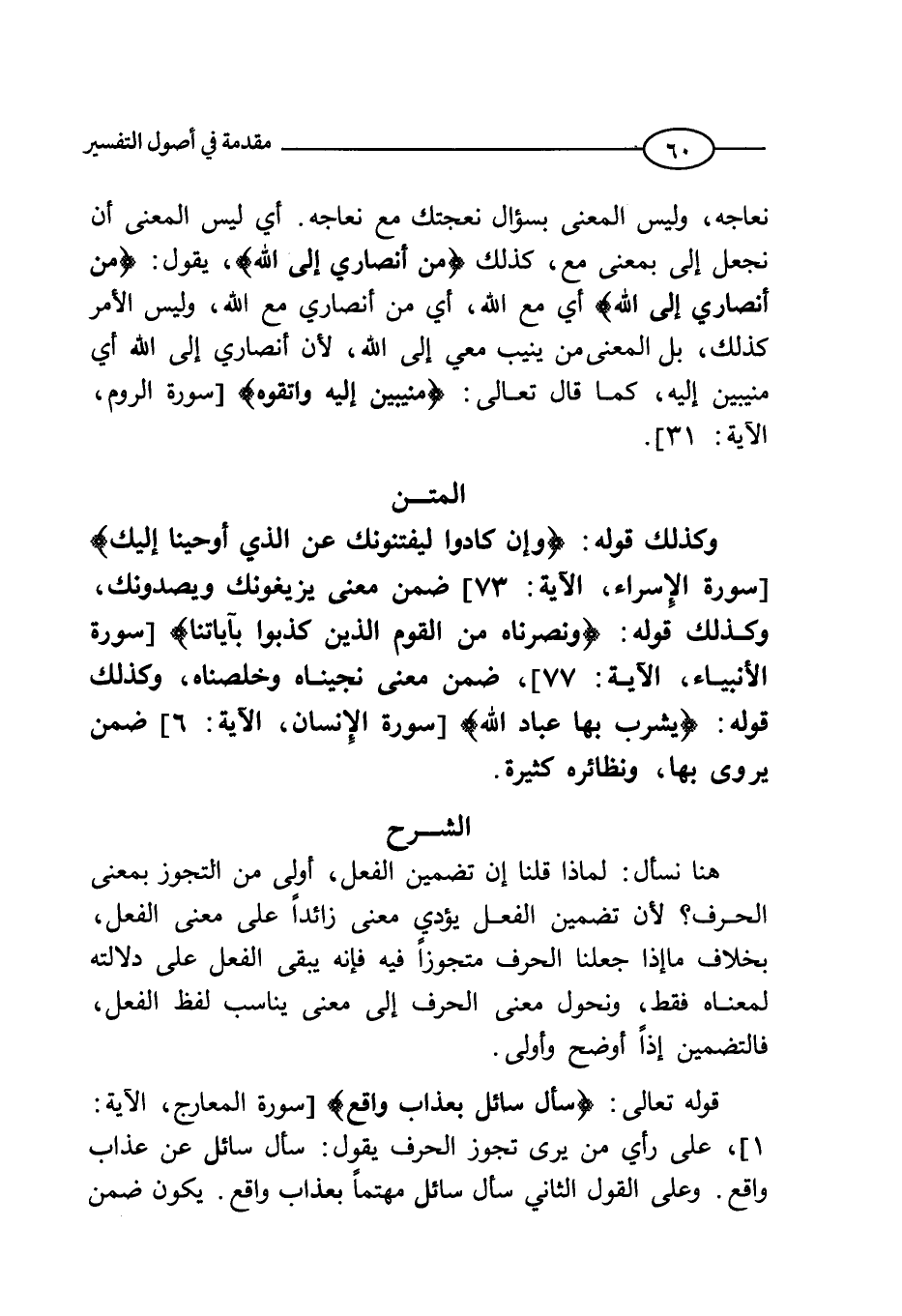 وكذلك قوله: (وَإِنْ كَادُوا لَيَفْتِنُونَكَ عَنِ الَّذِي أَوْحَيْنَا إِلَيْك) (الاسراء: 73) ضمن معني يزيغونك ويصدونك، وكذلك قوله (وَنَصَرْنَاهُ مِنَ الْقَوْمِ الَّذِينَ كَذَّبُوا بِآياتِنَا) (الانبياء: 77) ضمن معني نجيناه وخلصناه، وكذلك قوله (يَشْرَبُ بِهَا عِبَادُ اللَّه) (الانسان: 6) ، ضمن يروي بها، ونظائره كثيرة.
