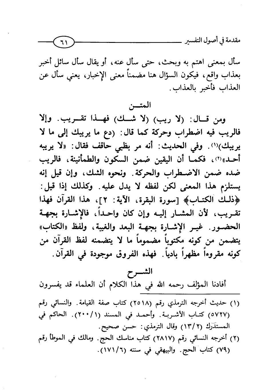 ومن قال: ((لا ريب)) لا شك) فهذا تقريب. وإلا فالريب فيه اضطراب وحركة كما قال: ((دع ما يريبك إلي ما لا يريبك)) (¬1) وفي الحديث: أنه مر بظبي حاقف فقال: ((لا يريبه أحد)) (¬2) ، فكما أن اليقين ضمن السكون والطمأنينة، فالريب ضده ((ضمن الاضطراب والحركة)) لفظ الشك وإن قيل: إنه يستلزم هذا المعنى لكن لفظه لا يدل عليه. وكذلك إذا قيل: (ذلك الْكِتَاب) (البقرة: 2) هذا القرآن فهذا تقريب؛ لأن المشار إليه وإن كان واحداً، فالإشارة بجهة الحضور غير الإشارة بجهة البعد والغيبة، ولفظ ((الكتاب)) يتضمن من كونه مكتوباً مضموماً ما لا يتضمنه لفظ القرآن من كونه مقروءا مظهراً باديا. فهذه الفروق موجودة في القرآن.