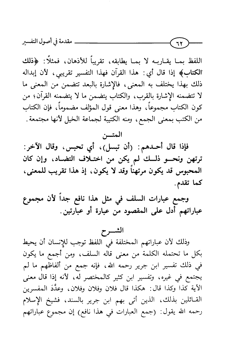 وذلك لأن عباراتهم المختلفة في اللفظ توجب للإنسان أن يحيط بكل ما تحتمله الكلمة من معنى قاله السلف، ومن أجمع ما يكون في ذلك تفسير ابن جرير- رحمه الله- فإنه جمع من ألفاظهم ما لم يجتمع في غيره، وتفسير ابن كثير كالمختصر له؛ لأنه إذا قال معنى الآية كذا وكذا قال: هكذا قال فلان وفلان وفلان، وعدد المفسرين القائلين بذلك، الذين أتى بهم ابن جرير بالسند، فشيخ الإسلام رحمة الله يقول: ((جمع العبارات في هذا نافع)) لأن مجموع عباراتهم