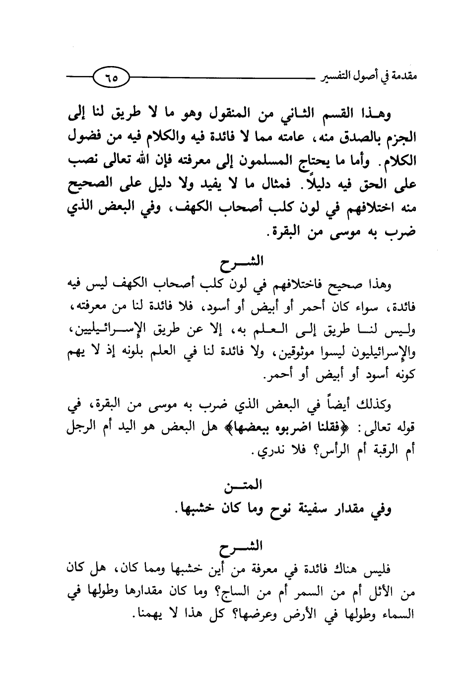 فليس هناك فائدة في معرفة من أين خشبها ومما كان، هل كان من الأثل، أم من السمر، أم من الساج؟ وما كان مقدارها وطولها في السماء وطولها في الأرض وعرضها؟ كل هذا لا يهمنا.