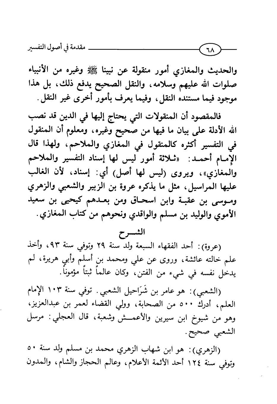 فالمقصود أن المنقولات التي يحتاج إليها في الدين قد نصب الله الأدلة على بيان ما فيها من صحيح وغيره، ومعلوم أن المنقول في التفسير أكثره كالمنقول في المغازي، والملاحم، ولهذا قال الإمام أحمد: ((ثلاثة أمور ليس لها إسناد: التفسير والملاحم والمغازي)) ويروي: ((ليس لها أصل)) أي: إسناد؛ لأن الغالب عليها المراسيل، مثل ما يذكره عروة بن الزبير (¬1) ، والشعبي (¬2) ، والزهري (¬3) ، وموسى بن عقبة (¬4) ، وابن إسحاق (¬5) ،