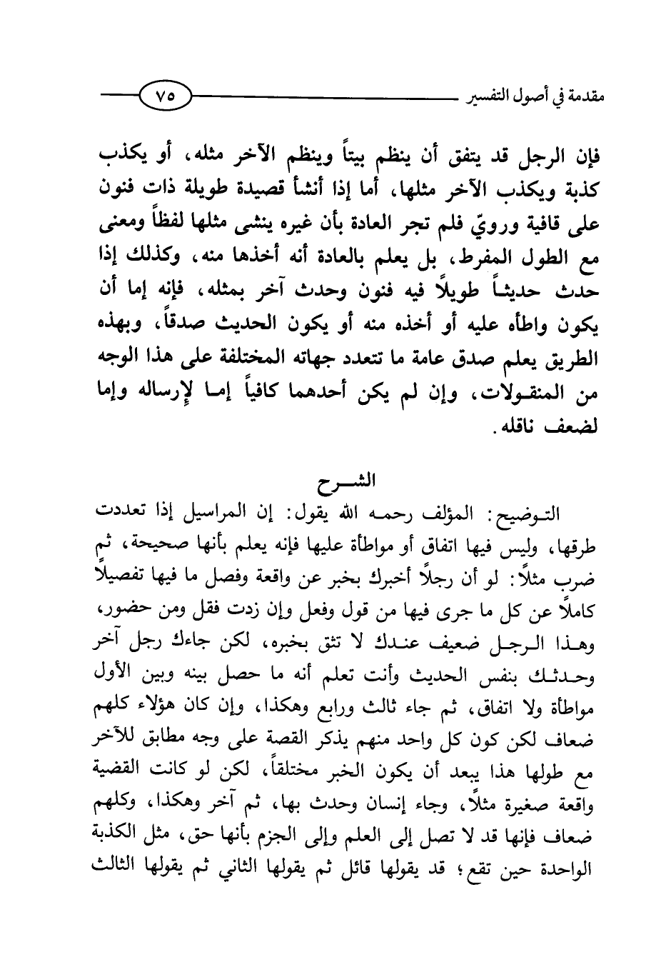 فإن الرجل قد يتفق أن ينظم بيتاً وينظم الآخر مثله، أو يكذب كذبة ويكذب الآخر مثلها، أما إذا أنشأ قصيدة طويلة ذات فنون على قافية وروى فلم تجر العادة بأن غيره ينشئ مثلها لفظاً ومعنى مع الطول المفرط، بل يعلم بالعادة أنه أخذها منه، وكذلك إذا حدث حديثاً طويلاً فيه فنون وحدث آخر بمثله، فإنه إما أن يكون واطأه عليه أو أخذه منه أو يكون الحديث صدقاً، وبهذه الطريق يعلم صدق عامة ما تتعدد جهاته المختلفة على هذا الوجه من المنقولات، وإن لم يكن أحدها كافياً إما لإرساله وإما لضعف ناقله.