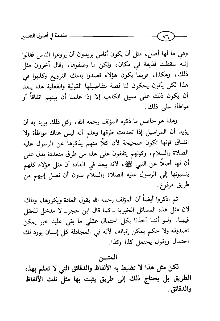ثم اذكر أيضاً أن المؤلف رحمه الله يقول العادة ويكررها، وذلك لأن مثل هذه المسائل الخبرية- كما قال ابن حجر- لا مدخل للعقل فيها، ولو أننا أخذنا بكل احتمال عقلي ما بقي علينا خبر يمكن تصديقه ولا حكم يمكن إثباته؛ لأنه في المجادلة كل إنسان يورد لك احتمالاً ويقول يحتمل كذا وكذا.