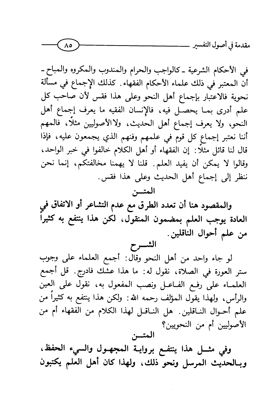 في الأحكام الشرعية-كالواجب والحرام والمندوب والمكروه والمباح- المعتبر في ذلك علماء الأحكام الفقهاء. كذلك الإجماع في مسألة نحوية، الاعتبار بإجماع أهل النحو، وعلى هذا فقس، لأن صاحب كل علم أدري بما يحصل فيه، فالإنسان الفقيه لا يعرف إجماع أهل النحو، ولا يعرف إجماع أهل الحديث، ولا الأصوليين مثلاً، فالمهم أننا نعتبر إجماع كل قوم في علمهم وفنهم الذي يجمعون عليه، فإذا قال لنا قائل مثلاً: إن الفقهاء أو إن أهل الكلام خالفوا في خبر الواحد، وقالوا: لا يمكن أن يفيد العلم، قلنا لا يهمنا مخالفتهم، إنما نحن ننظر إلي إجماع أهل الحديث وعلى هذا فقس.
