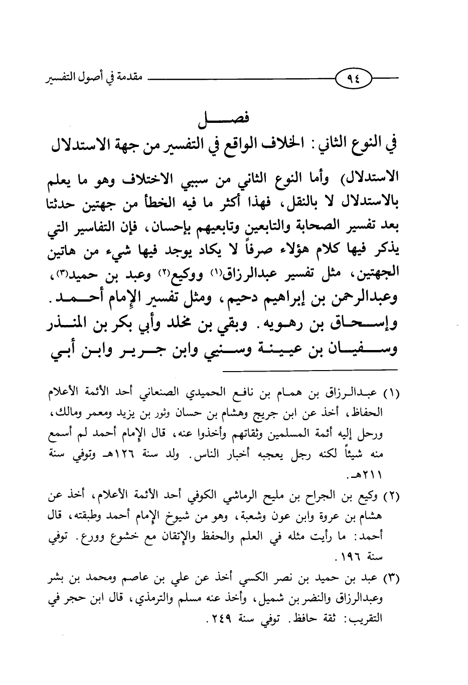 وأما النوع الثاني من سببي الاختلاف وهو ما يعلم بالاستدلال لا بالنقل، فهذا أكثر ما فيه الخطأ من جهتين حدثتا بعد تفسير الصحابة والتابعين وتابعيهم بإحسان، فإن التفاسير التي يذكر فيها كلام هؤلاء صرفا لا يكاد يوجد فيها شيء من هاتين الجهتين، مثل تفسير عبد الرزاق (¬1) ووكيع (¬2) وعبد بن حميد (¬3) وعبد الرحمن بن إبراهيم دحيم،، ومثل تفسير الإمام أحمد، وإسحاق بن راهوية، وبقي بن مخلد، وأبي بكر بن المنذر، وسفيان بن عيينه، وسنيد، وابن جرير، وابن أبي