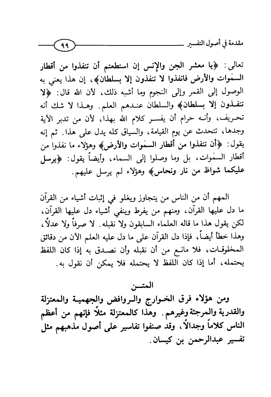 تعالي: (يَا مَعْشَرَ الْجِنِّ وَالْإنْسِ إِنِ اسْتَطَعْتُمْ أَنْ تَنْفُذُوا مِنْ أَقْطَارِ السَّمَاوَاتِ وَالْأَرْضِ فَانْفُذُوا لا تَنْفُذُونَ إِلَّا بِسُلْطَانٍ) (الرحمن: 33) ، إن هذا يعني الوصول إلى القمر وإلى النجوم وما أشبه ذلك، لأن الله قال: (لا تَنْفُذُونَ إِلَّا بِسُلْطَانٍ) والسلطان عندهم العلم. وهذا لا شك أنه تحريف، وأنه حرام ان يفسر كلام الله بهذا، لأن من تدبر الآية وجدها تتحدث عن يوم القيامة، والسياق كله يدل على هذا. ثم إنه يقول: (أَنْ تَنْفُذُوا مِنْ أَقْطَارِ السَّمَاوَاتِ وَالْأَرْضِ فَانْفُذُوا) وهؤلاء ما نفذوا من أقطار السموات، بل ما وصلوا إلي السماء، وأيضاً يقول: (يُرْسَلُ عَلَيْكُمَا شُوَاظٌ مِنْ نَارٍ وَنُحَاسٌ) وهؤلاء لم يرسل عليهم.